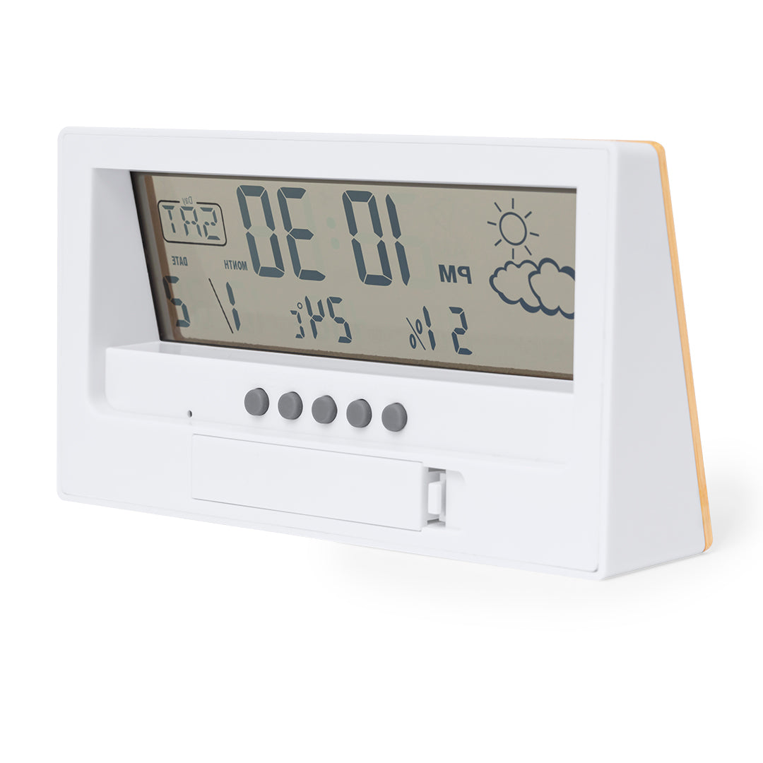 Estació meteorològica amb frontal a bambú. Amb sensor de temperatura i humitat. Funció calendari i alarma. Alimentació a pila (1xAAA no inclosa) i presentat en atractiva caixa de disseny kraft. Disponible manual d´instruccions en espanyol i anglès.
