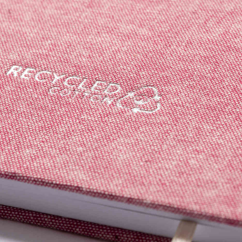 Bloc de notas de línea nature fabricado en 100% algodón reciclado. Con tapas duras y elástico de sujeción en contraste. Interior con 100 hojas lisas y marcapáginas de tela. Disponible en amplia gama de colores, con distintivo algodón reciclado en la contraportada.
