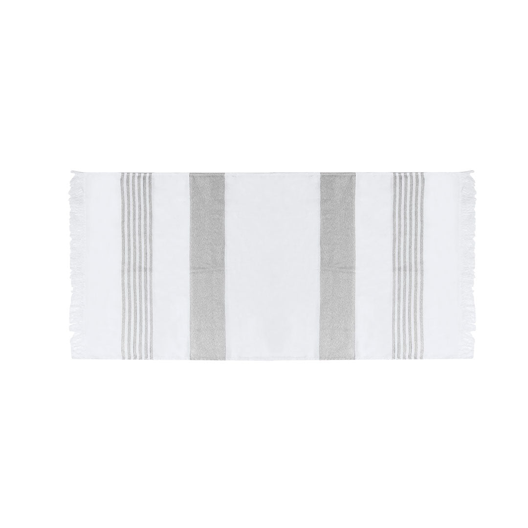 Su diseño presenta una base en blanco combinada con rayas de color y decorada por distinguidos flecos en los extremos.