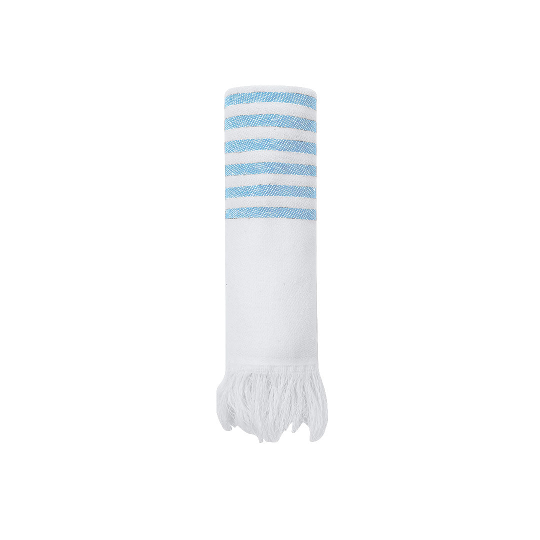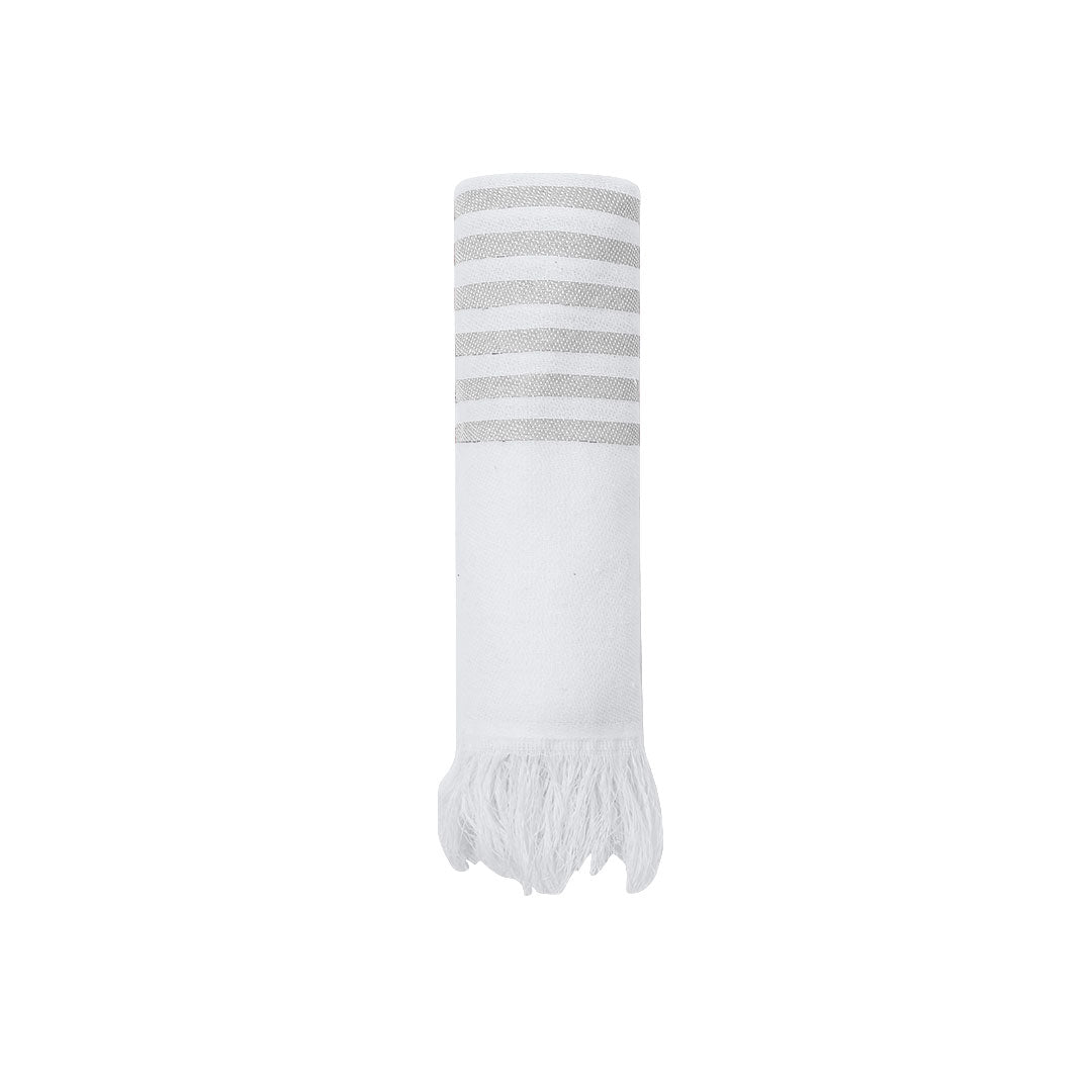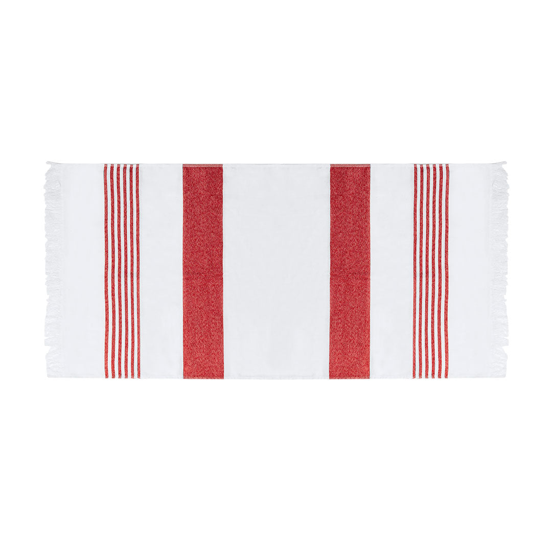 Su diseño presenta una base en blanco combinada con rayas de color y decorada por distinguidos flecos en los extremos.