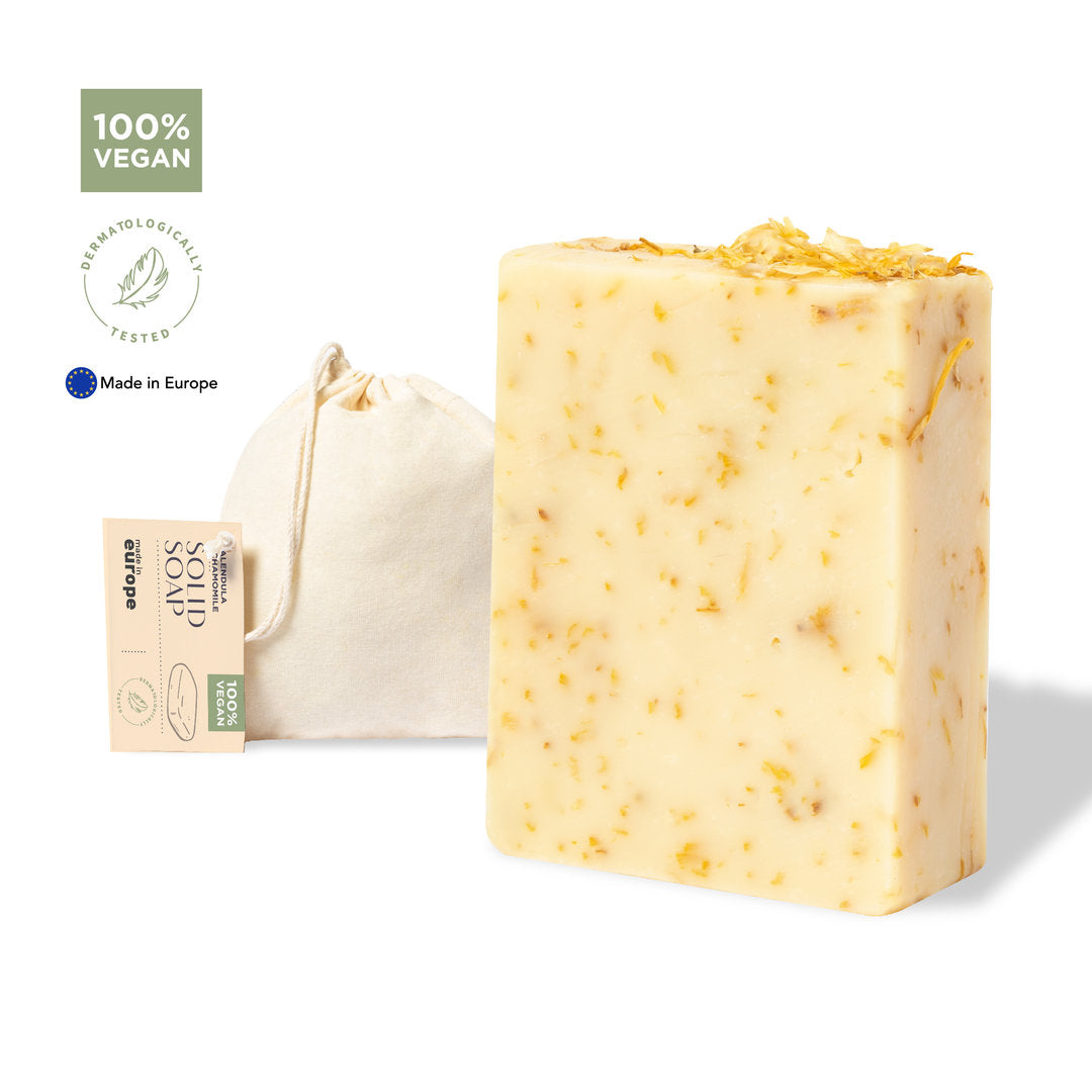 Pastilla de jabón vegano de 100 gr. Aroma de caléndula y manzanilla; con propiedades calmantes, hidratantes y reparadoras. Dermatológicamente testado y de fabricación europea. Presentación en bolsa individual de algodón, con cierre de cordón y etiqueta distintiva.