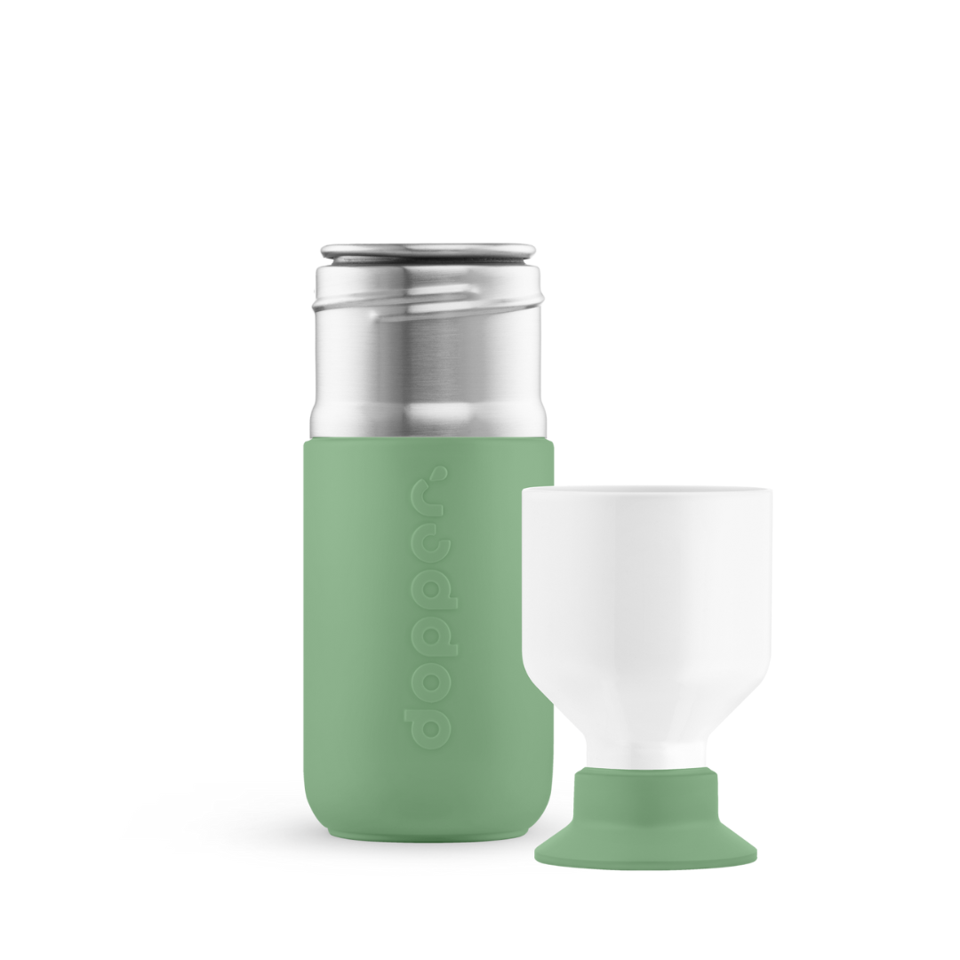 Fabricada con un cuerpo de acero inoxidable y un revestimiento de polvo duradero, combina resistencia y estilo sostenible. Su diseño característico de tres partes (botella y vaso en uno) permite un fácil llenado, limpieza, almacenamiento y también compartir.