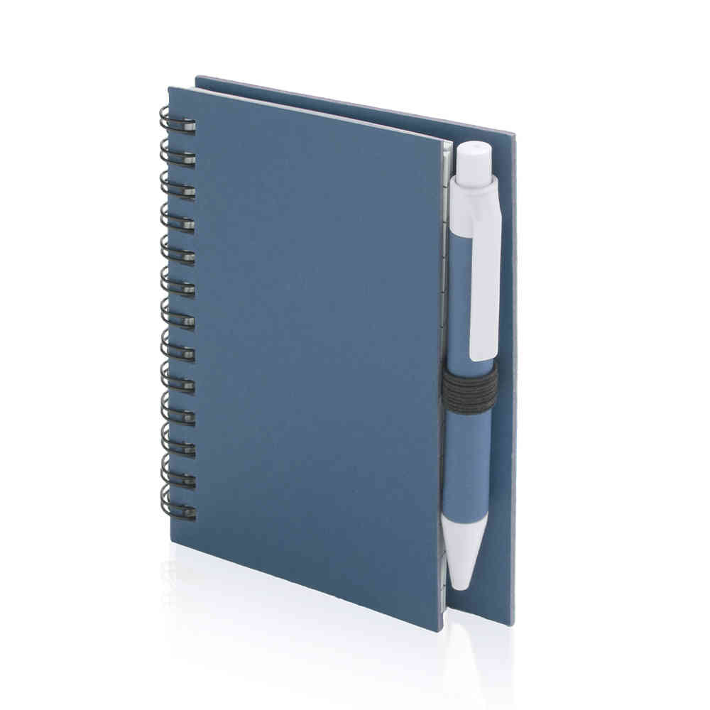 Libreta de anillas con tapas de suave tacto acabadas en resistente cartón reciclado y bolígrafo en cartón reciclado a juego. De atrevidos colores, 50 hojas con distribución a una raya y con soporte para bolígrafo en contraportada.