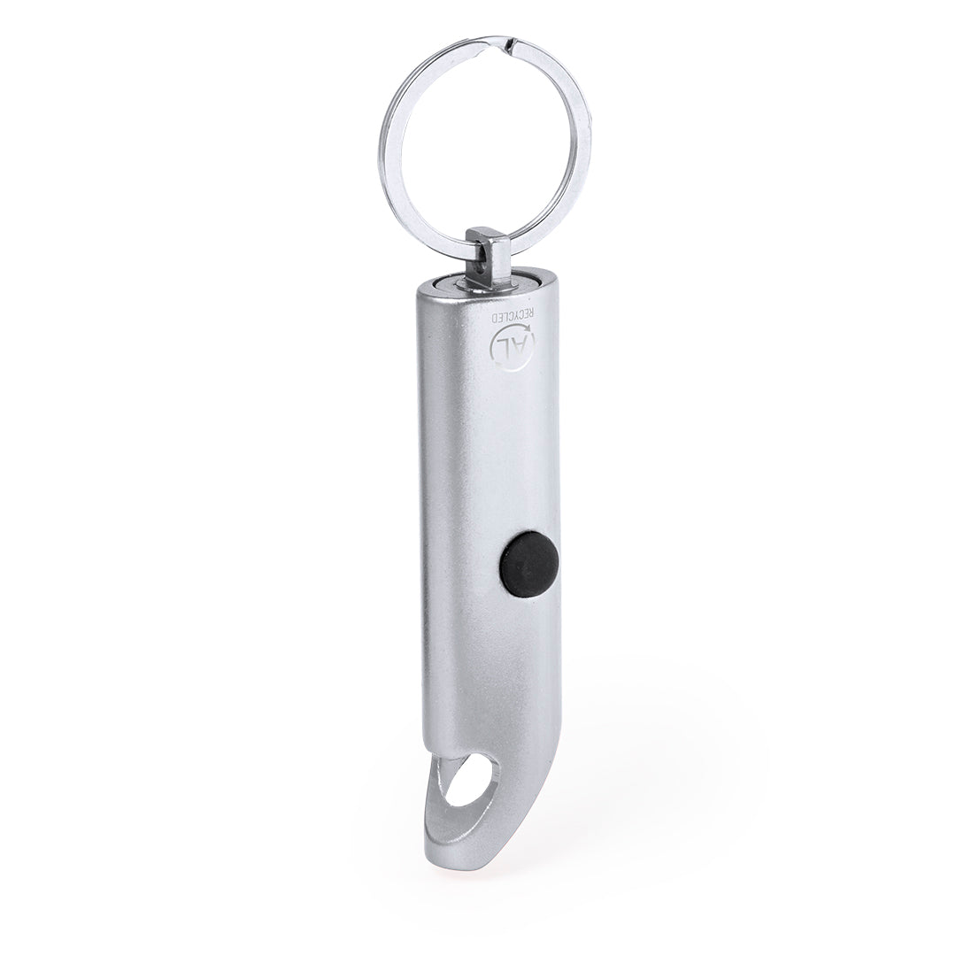 Resistente llavero abridor fabricado en Aluminio Reciclado. Este práctico accesorio cuenta con 3 luces LEDs alimentadas por pilas de botón incluidas. Su diseño incluye un abridor, ofreciendo versatilidad en un solo dispositivo. Incluye logotipo Aluminio Reciclado en un lateral y está disponible en una variada gama de colores. Presentada en caja de diseño kraft.