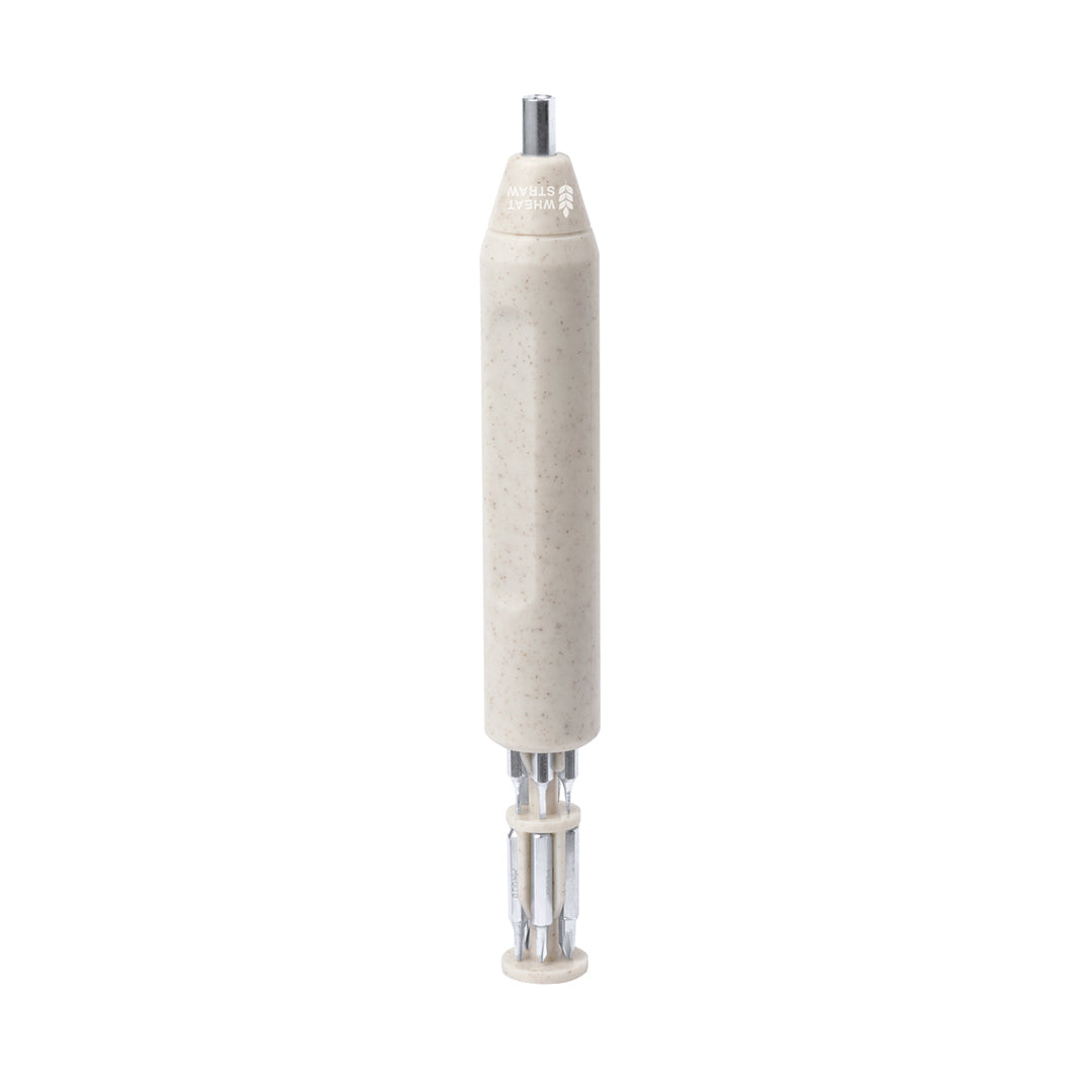 Práctica multiherramienta fabricada en caña de trigo con forma de destornillador. Incluye un compartimento en la empuñadura para guardar las múltiples puntas magenéticas (planas y philips). Con logotipo caña de trigo incluido. Presentada en caja de diseño kraft.