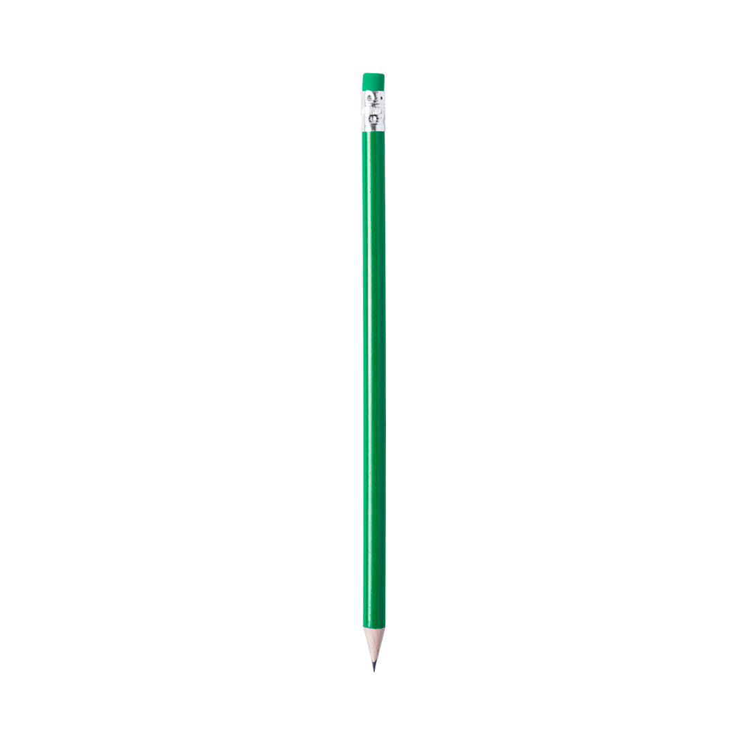 Lápiz de madera de acabado brillo. Con cuerpo redondo y goma de borrar a juego. Disponible en variada gama de colores. Mina negra y punta afilada.