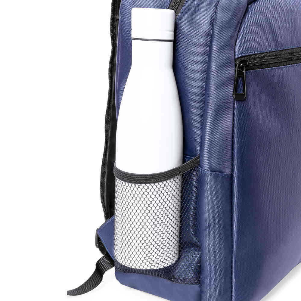 Mochila de alta calidad fabricada en RNYLON 420D. Compartimento principal con cierre de cremallera a juego y doble tirador. Incluye bolsillo exterior de cremallera y 2 bolsillos laterales de redecilla. Acolchado en asa, parte trasera y cintas para hombros, estas últimas ajustables. Interior con compartimento acolchado para ordenador portátil de hasta 15 pulgadas y accesorio en espalda para ajuste en trolley. Disponible en variada gama de colores, con distintivo reciclado en etiqueta exterior.