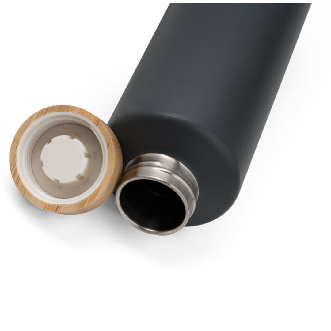 Botella reutilizable con diseño premium, fabricada en acero inoxidable (36% reciclado) con doble pared de aislamiento al vacío y revestimiento interior de cobre, que garantiza una conservación térmica excepcional: hasta 16 horas para bebidas calientes y 48 horas para frías.