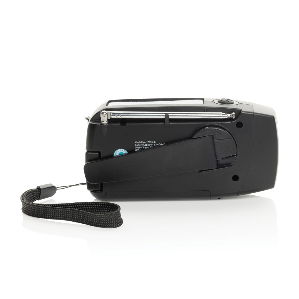 Incluye radio AM/FM, linterna LED de 1W, panel solar integrado, batería recargable de 1800 mAh y conexiones USB/USB-C para cargar tu smartphone u otros dispositivos. Gracias a su mecanismo de manivela, con solo un minuto de carga manual obtendrás hasta 5 minutos de radio o 30 minutos de luz, asegurando autonomía incluso en emergencias.