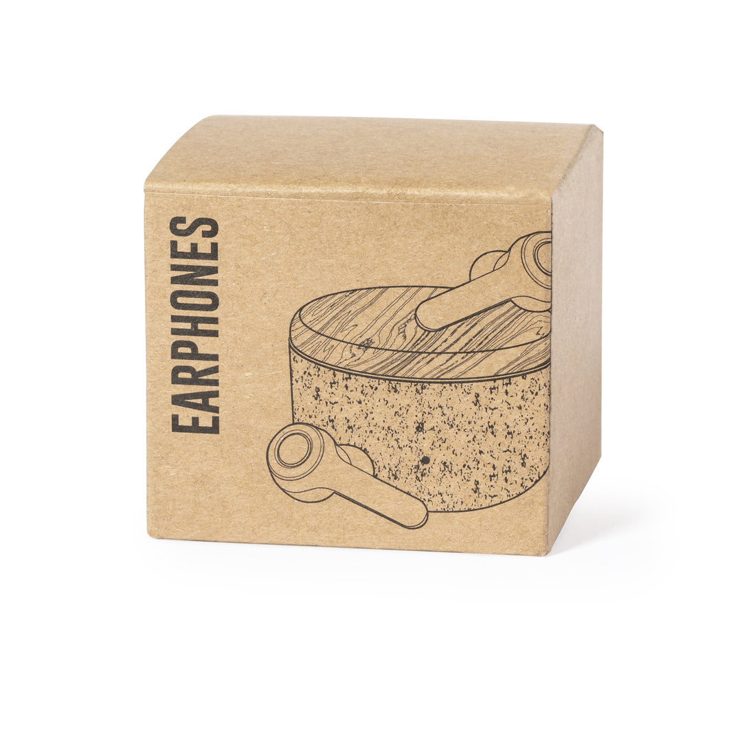 Auriculares intraurales de conexión Bluetooth® 5.0, con batería integrada de litio de 30 mAh en cada auricular y en elegante acabado de color blanco. De diseño ergonómico, incluyen botón de control táctil en el auricular y función manos libres. Base de carga en corcho natural con tapa en bambú. Base de 300 mAh de capacidad e indicador LED de estado de carga, con cable de carga Tipo C incluido. Presentación en caja individual de diseño kraft, con manual de instrucciones en español e inglés.