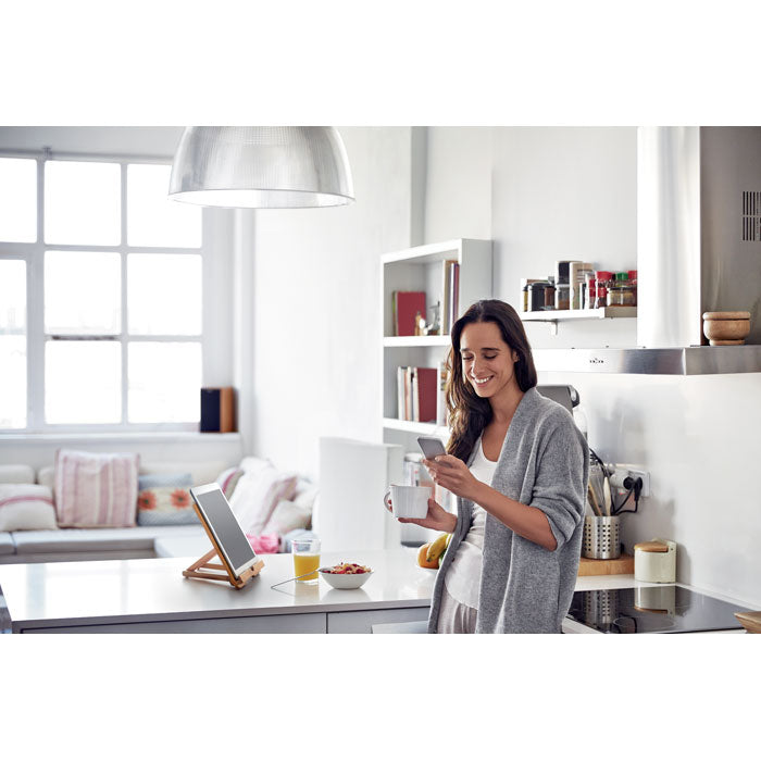 Soporte plegable para tablet o smartphone en bambú. Mira tus vídeos favoritos de YouTube o Netflix con este soporte plegable. También puedes utilizarlo para hacer videollamadas o incluso streamings en directo.