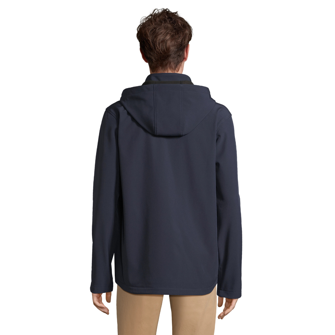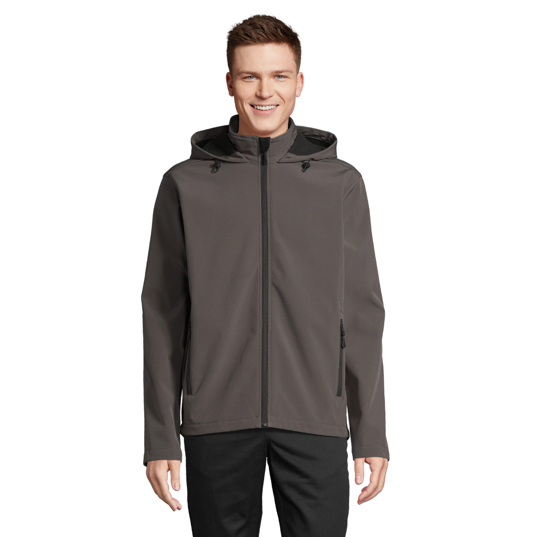 Chaqueta softshell para hombre de 280 g, diseñada para ofrecer comodidad y protección en cualquier ocasión. Cuenta con capucha ajustable, espalda ligeramente más larga y prácticos bolsillos laterales con cremallera de nylon negra y tiradores a juego, combinando funcionalidad y estilo.
