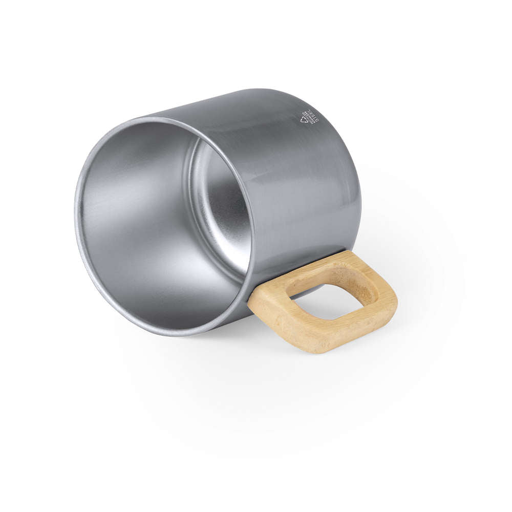 Original double-walled mug with a capacity of 400 ml. Made of recycled stainless steel, with a wooden handle for a comfortable grip. With the recycled stainless steel logo and available in various colours. Presented in an individual kraft design box with a paper protector.