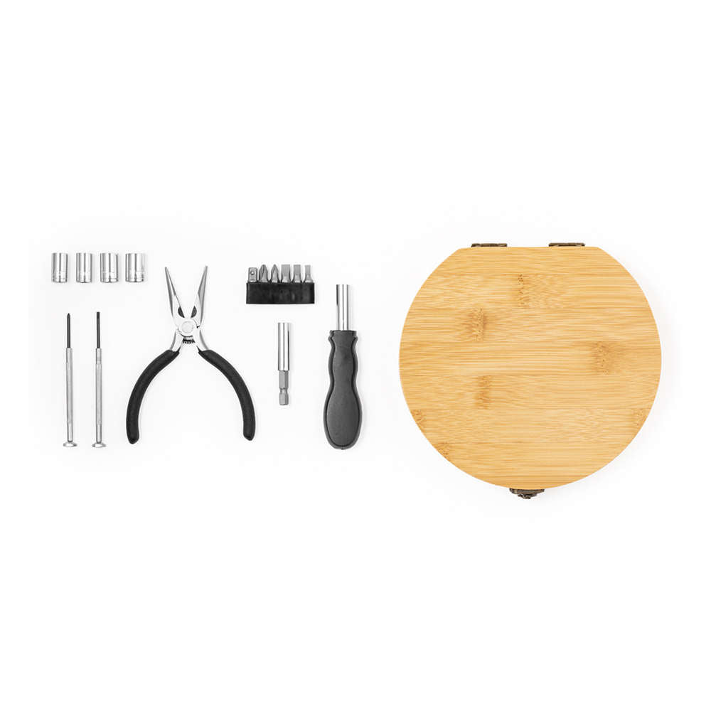 Tool set presented in a sturdy bamboo box with a metal clasp. With a bamboo die-cut interior for a perfect fit of the tools. Includes 15 accessories: socket wrenches, pliers with cutting section, precision screwdrivers (flat and Philips) and a screwdriver with a multitude of flat, Philips, hexagonal and Torx bits. Presented in a kraft design box.