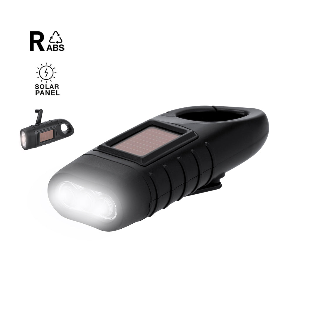 • Linterna ecológica de ABS reciclado con carga solar y manual por dinamo, regalo promocional sostenible