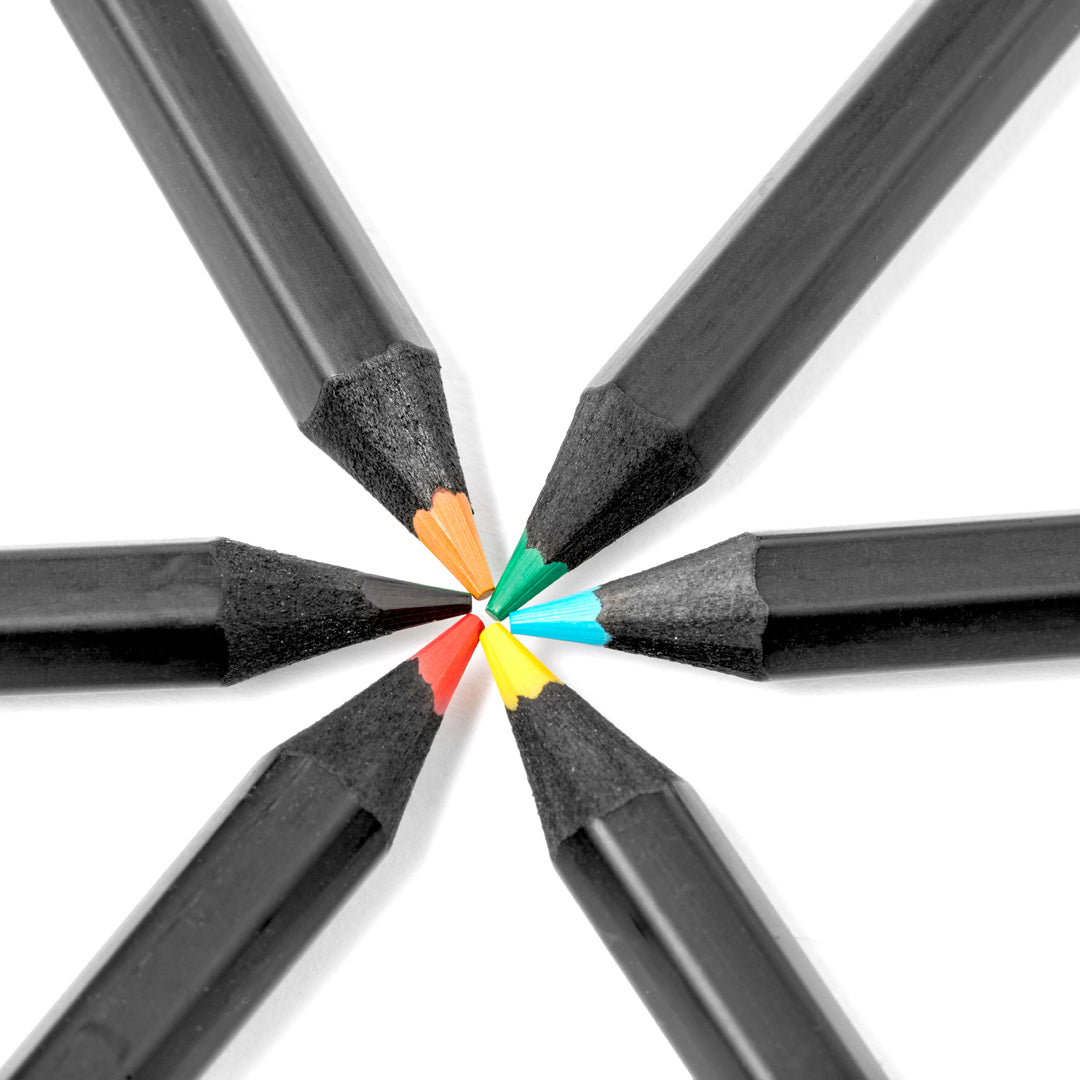 Set of 6 black finished wooden pencils with hexagonal body and multi-coloured leads. Presented in a black recycled cardboard case with flap closure.