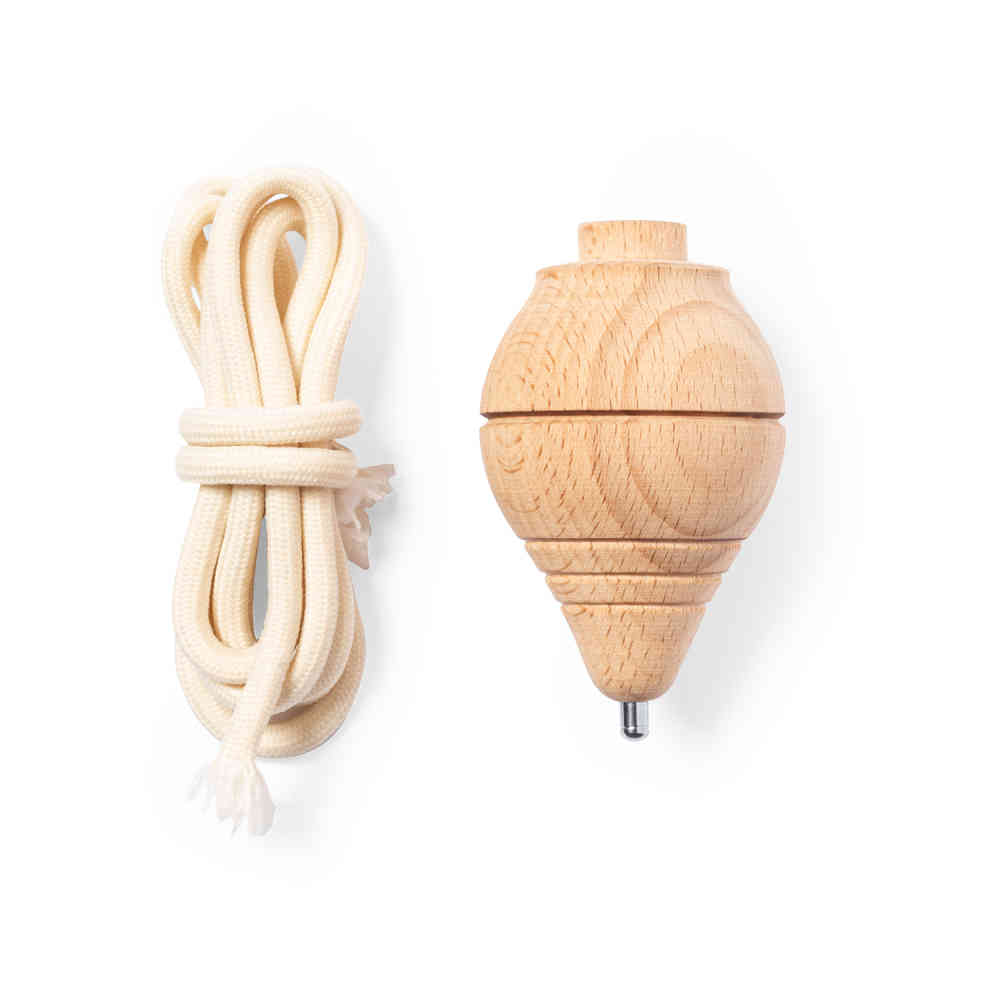 Spinning top made of sturdy solid wood, with a 120 cm long cotton rope.