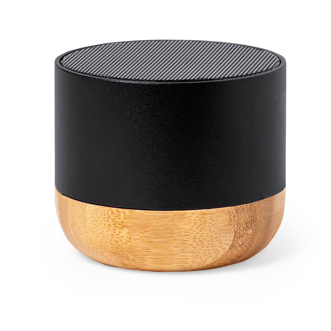 Eco speaker made from a combination of recycled aluminium casing and bamboo base. With Bluetooth® connection and 3W of power. 300mAh lithium battery and Recycled Aluminium logo. Presented in an individual kraft design box, with an instruction manual available in Spanish and English.
