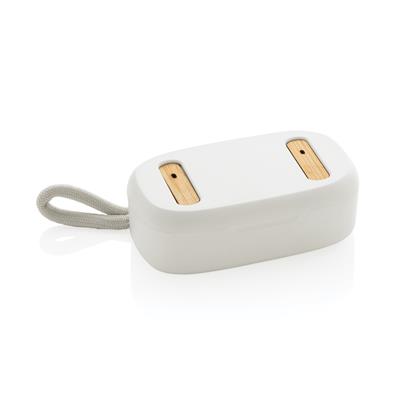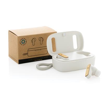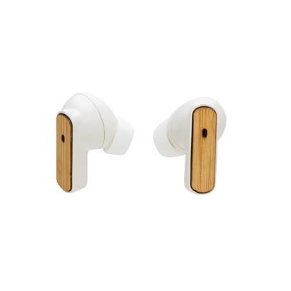 Next-generation FSC® 100% bamboo wireless earphones in RCS recycled ABS charging case.