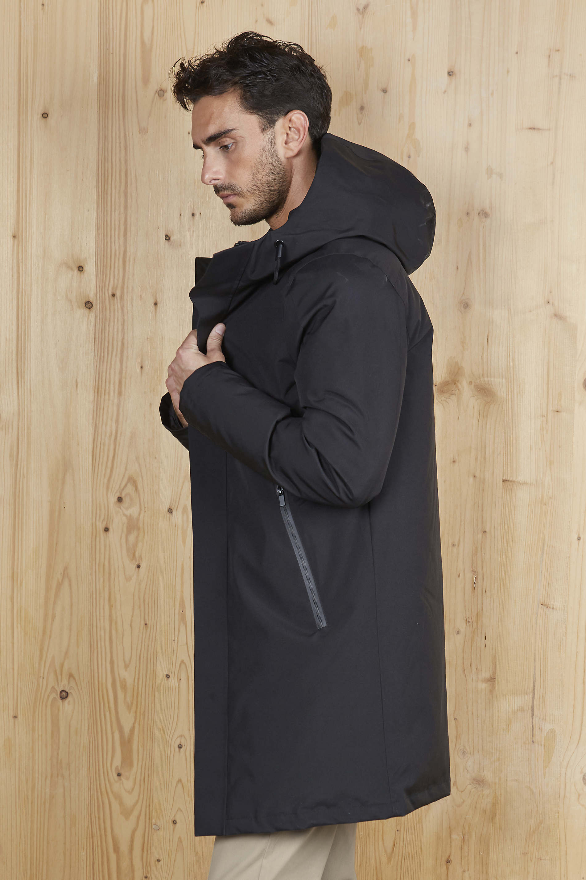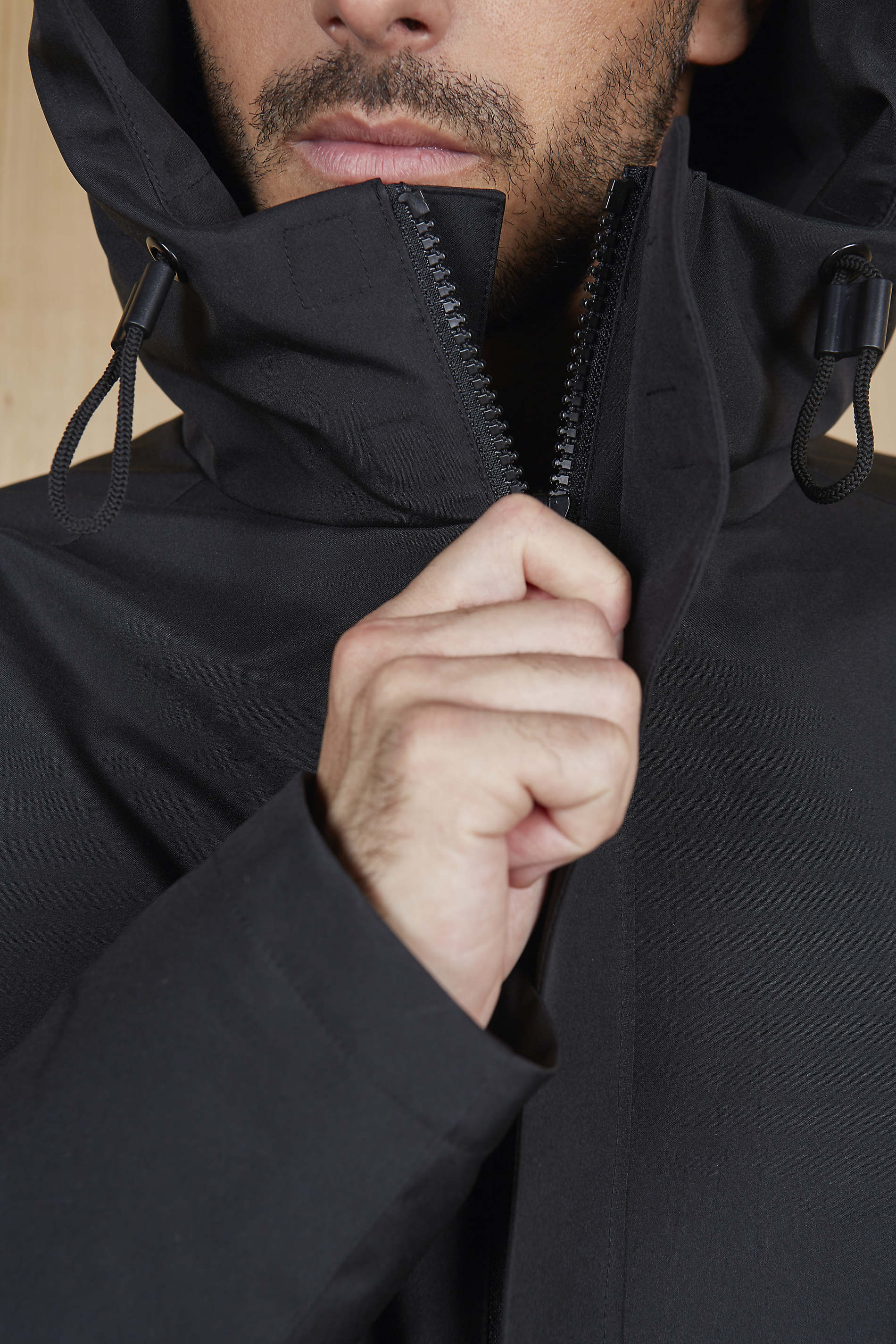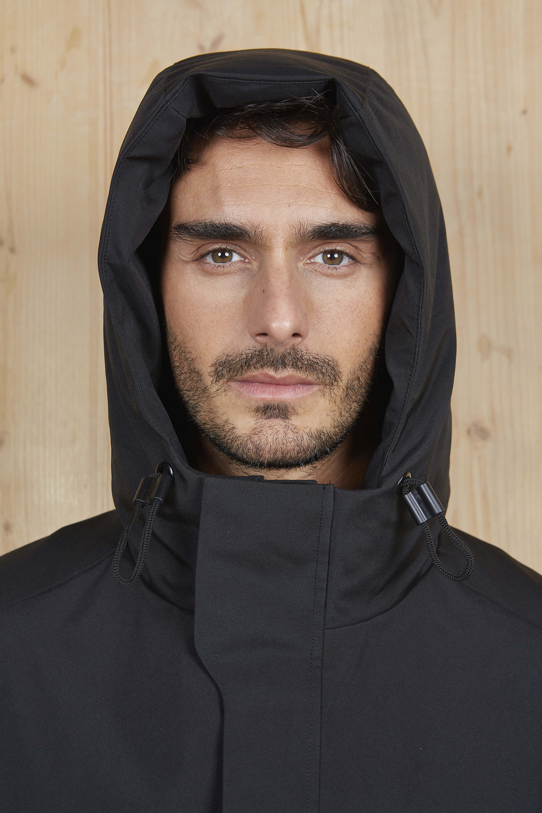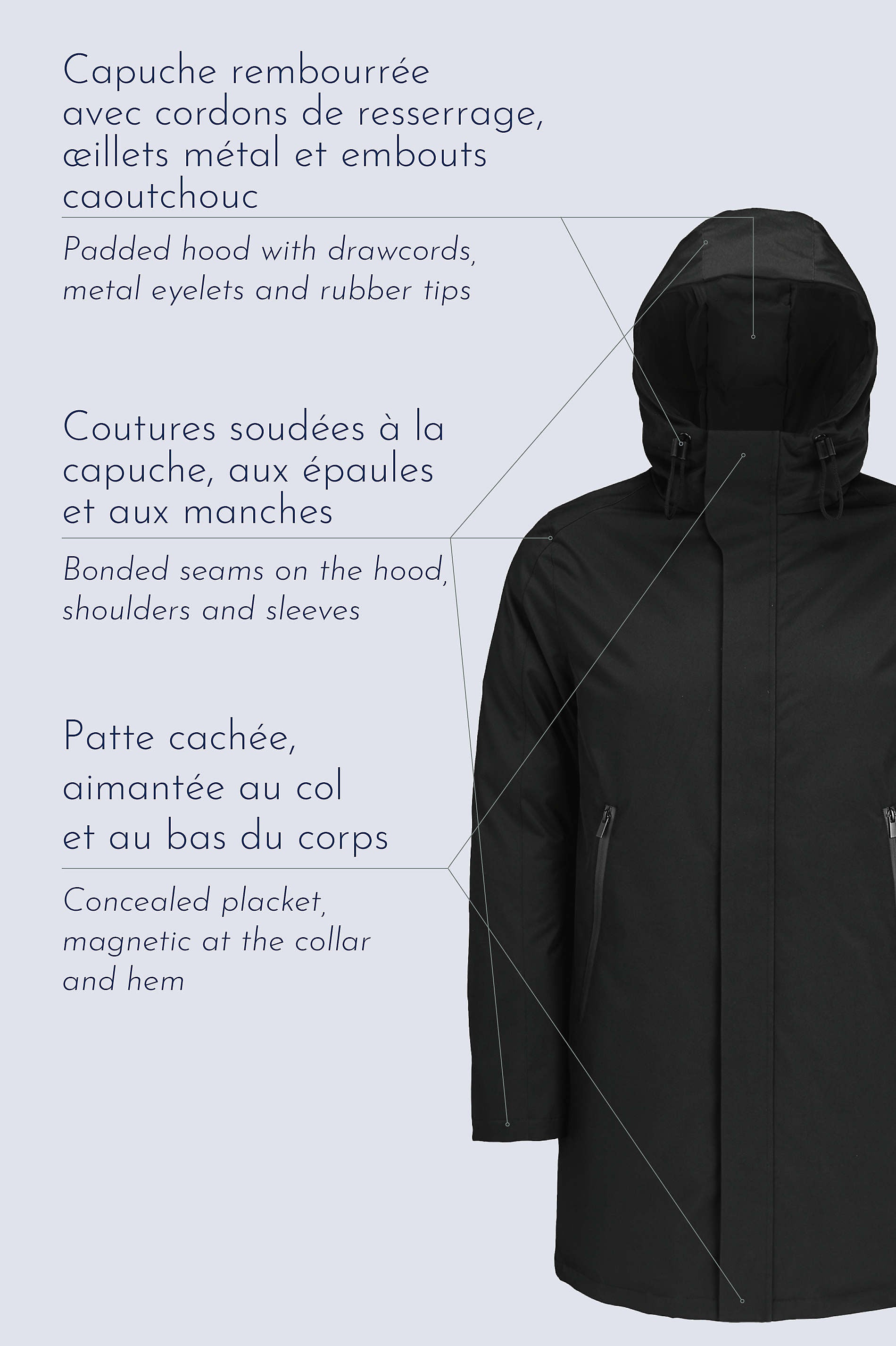 Opening with flap hidden by flap with magnetic buttons on the collar and bottom to offer maximum protection against the cold