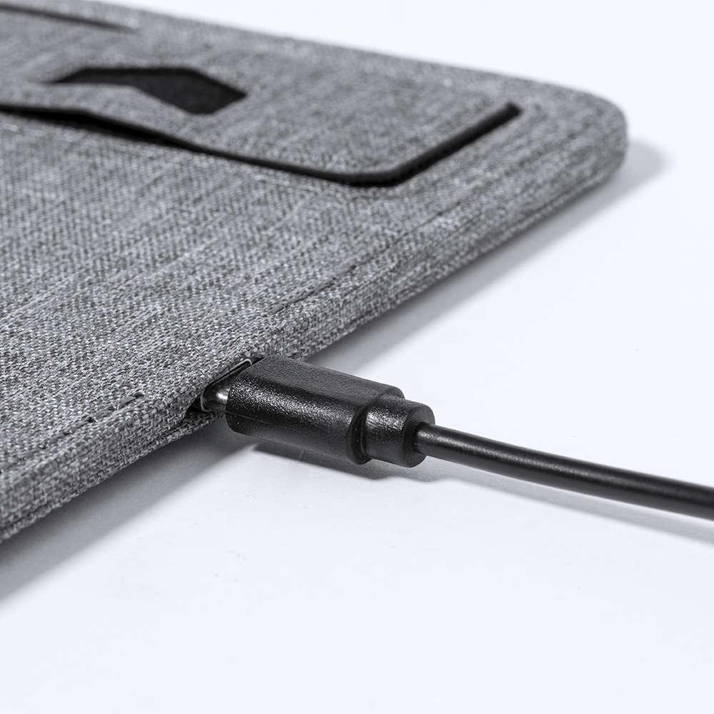Elegant and functional mouse pad made of soft RPET polyester. With Type C input - black Type C cable included - and 15W wireless charger, compatible with devices equipped with Qi wireless charging technology. Includes smartphone stand and pen holder. With non-slip base that guarantees stability and comfort of use. Includes instruction manual in Spanish and English. Presented in an individual kraft design box and in a recycled bag.