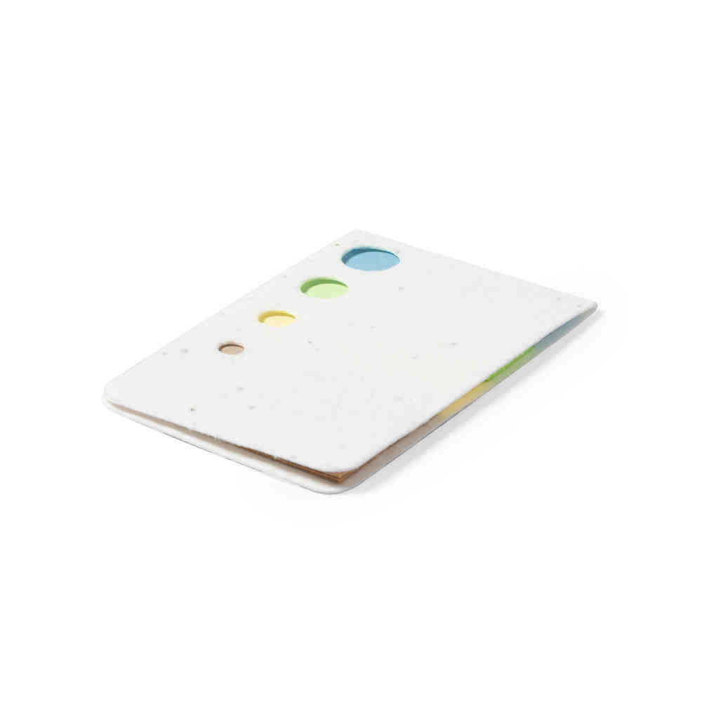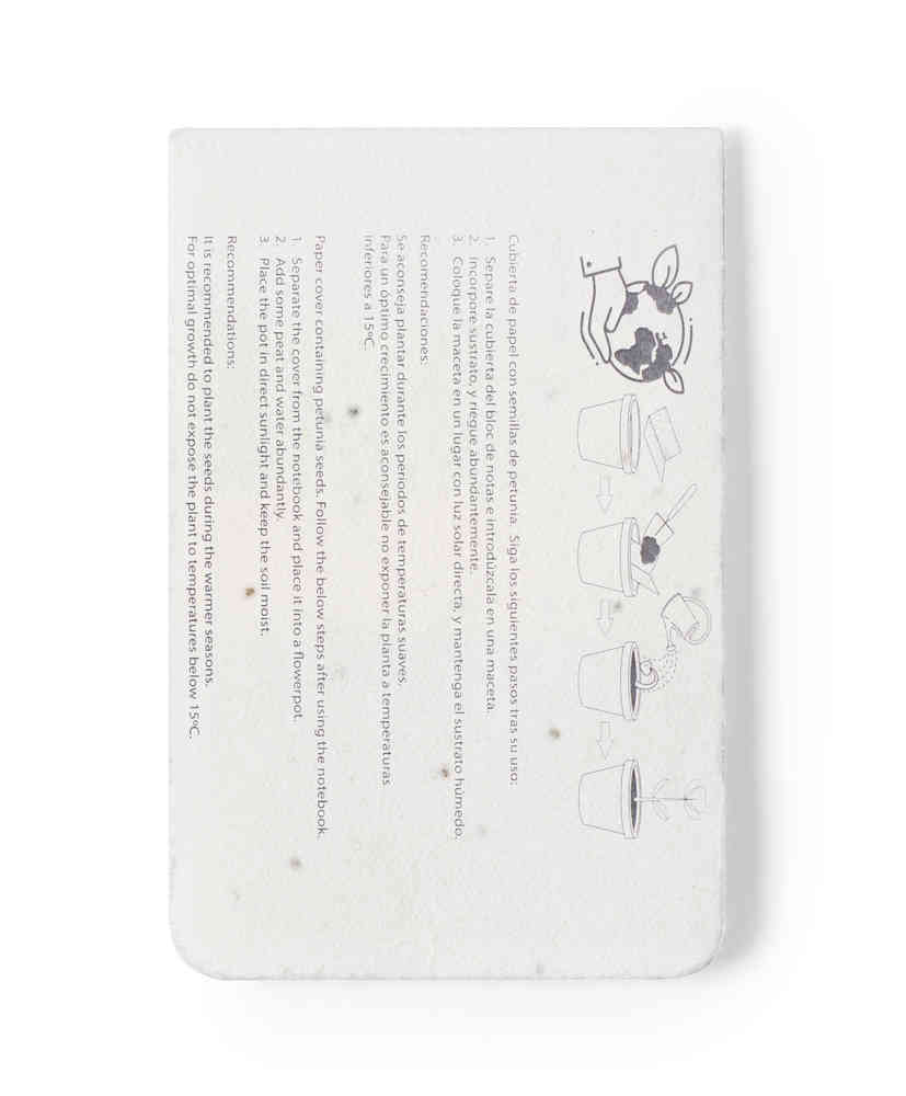 Nature line notepad, with covers made of seed paper, recyclable and degradable. Includes petunia seeds on both covers, making it plantable paper at the end of its useful life. Interior with 10 medium sticky notes and 30 mini sticky notes in various colors. Flowers in assorted colors, with planting instructions on the back cover and presented in an individual recycled paper bag.