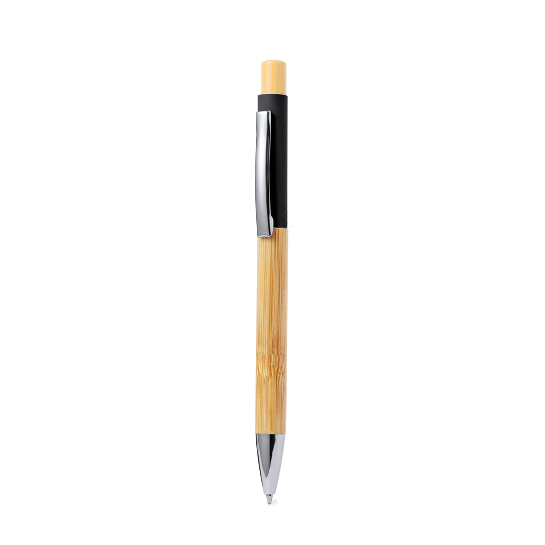 Elegant bamboo pen. Durable rubber-finished aluminium barrel and bamboo grip, with a barrel in a wide range of distinctive colours. Metal clip, push-button mechanism and blue ink. Presented in individual recycled bag.