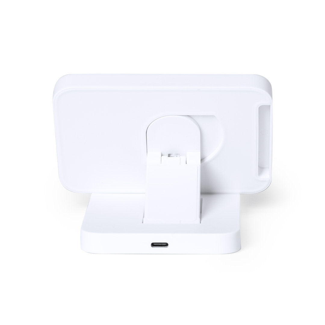 15W foldable wireless charger. With a base made of resistant white ABS and a bamboo charging surface, with an integrated telescopic stand. Compatible with devices equipped with Qi wireless charging technology, with a Type C charging cable included. Presented in an individual kraft-design box, with an instruction manual in Spanish and English.