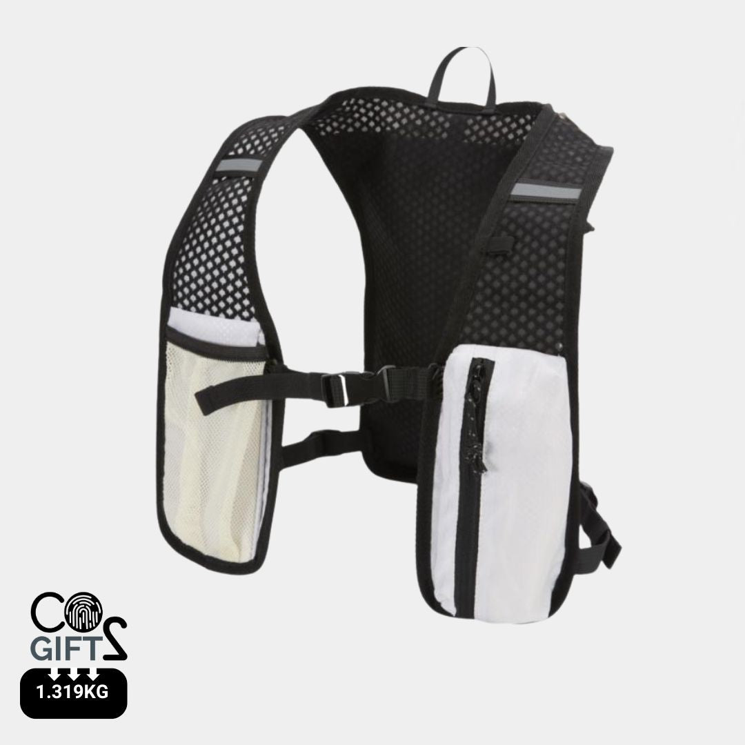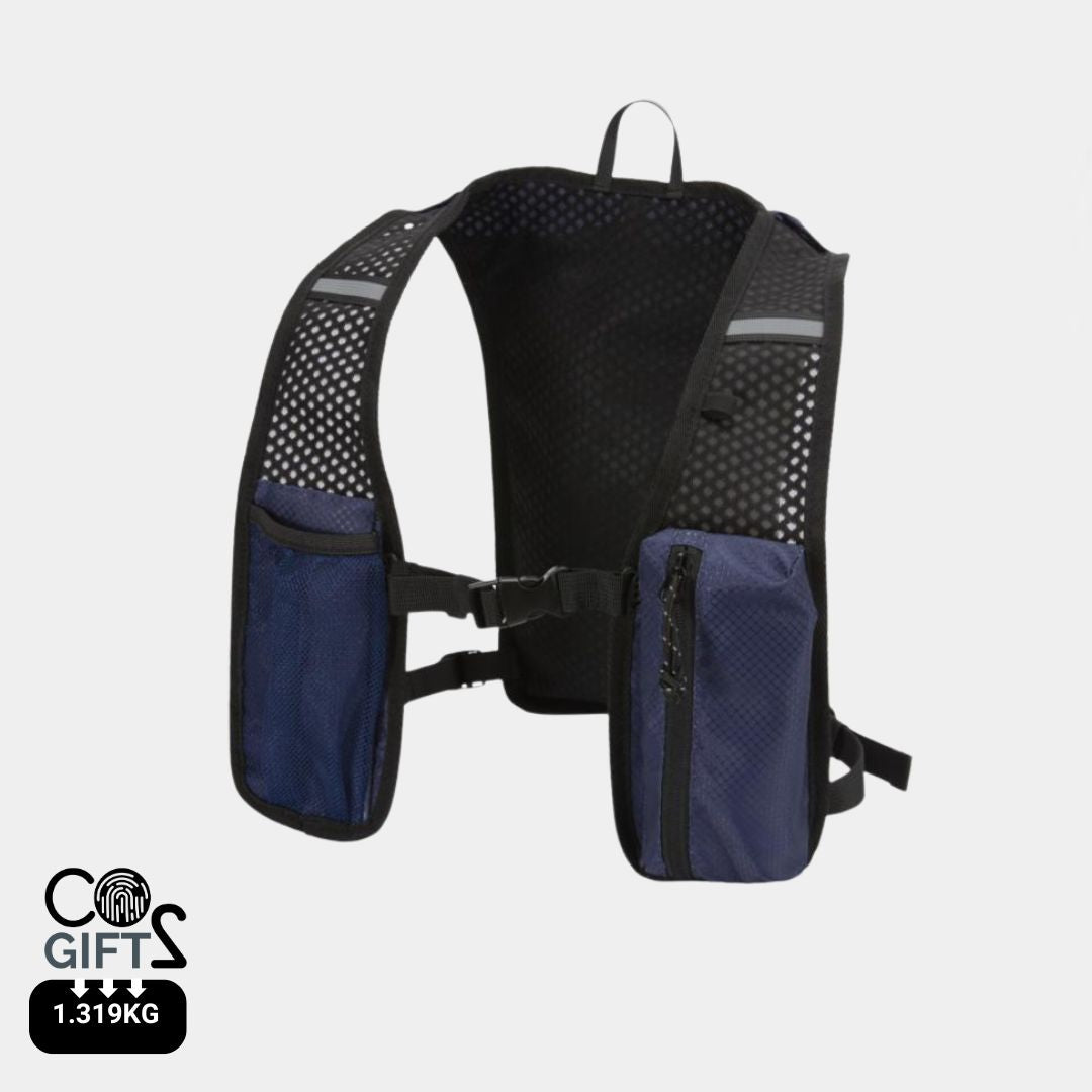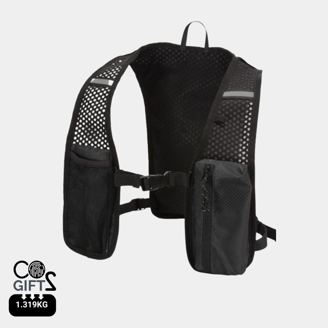 Diseñado para running de larga distancia, senderismo y actividades outdoor ligeras, incorpora espalda de malla transpirable, correas ajustables en los hombros, dos bolsillos delanteros en el pecho para botellas, móvil o accesorios pequeños, y un compartimento interior independiente para bolsa de hidratación de 1,5 litros no incluida. Con capacidad total de 5 litros, es una excelente alternativa para regalos promocionales sostenibles, regalos corporativos y productos promocionales personalizados vinculados a deporte, bienestar y campañas activas de merchandising para empresas. Además, este producto tiene la huella de carbono calculada de 1,319 kg CO2-eq, un dato especialmente relevante para empresas que quieren elegir artículos promocionales con impacto ambiental medible.