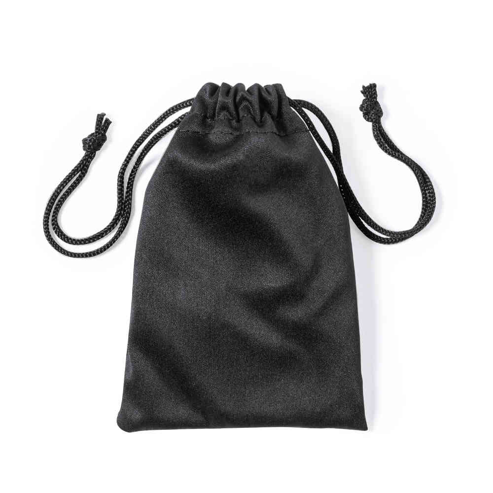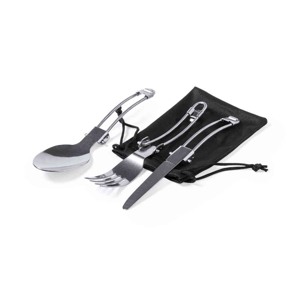 Folding spoon, knife and fork made of stainless steel. With die-cut handle and safety locks. Presented in individual RPET case with drawstring closure.