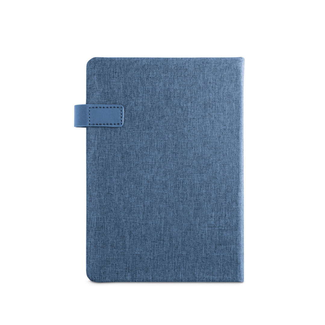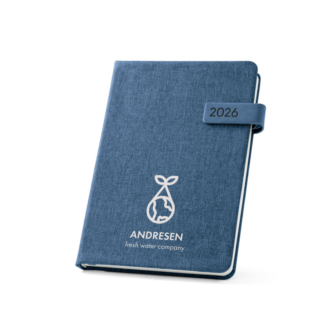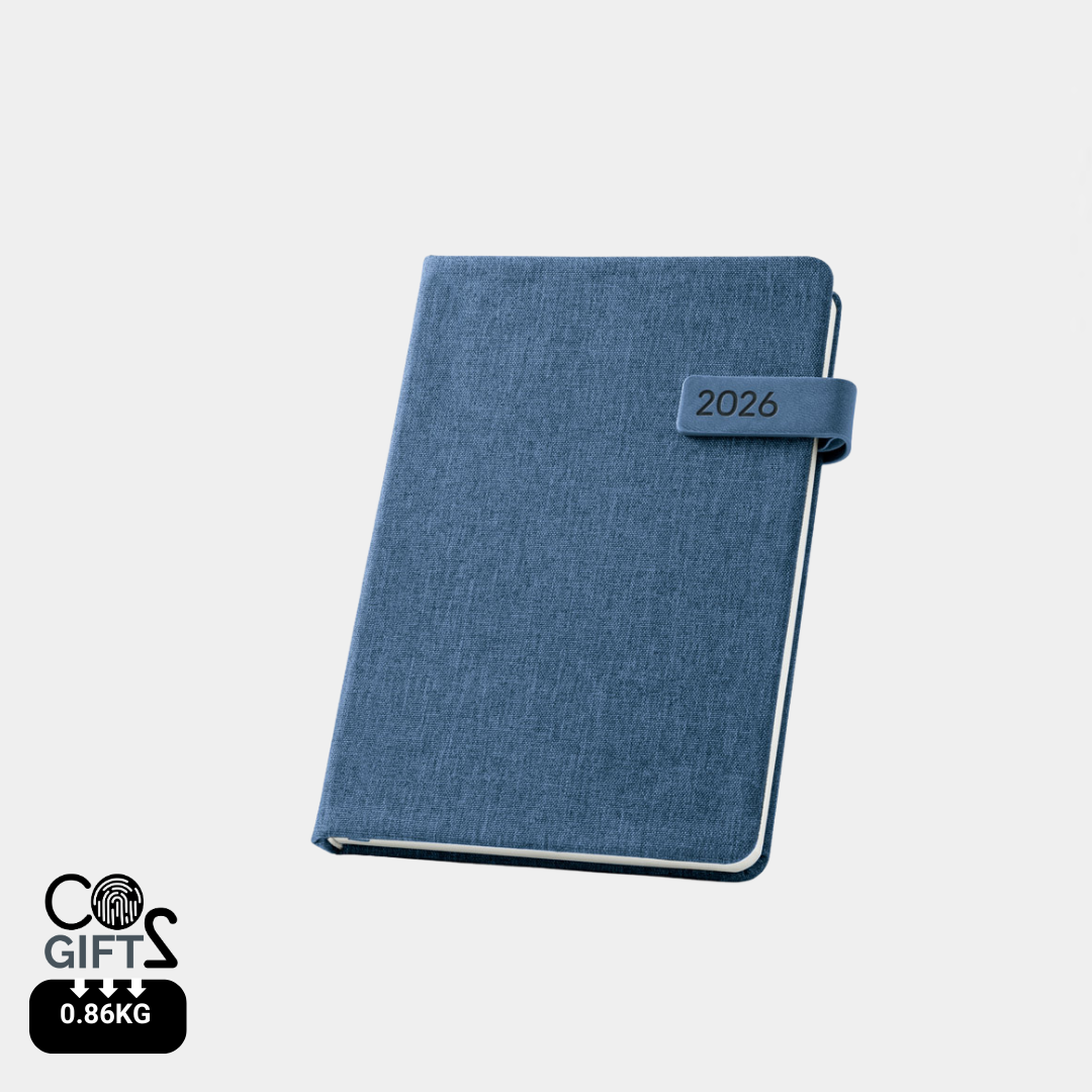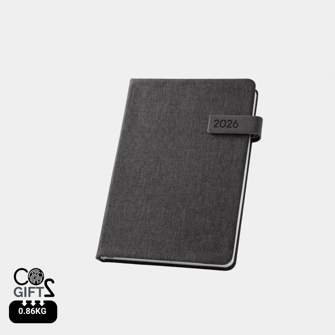 Agenda de tamaño A5 con cubierta fabricada en poliéster reciclado 100% rPET, perfecta para empresas que buscan un regalo de empresa sostenible y alineado con sus valores medioambientales. Diseñada con planificación diaria, incorpora marcapáginas, cierre elástico a juego y soporte para bolígrafo (no incluido).