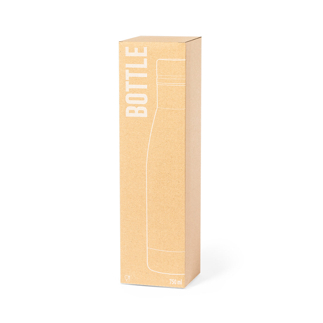Bidón de 750 ml de capacidad, fabricado en acero inox y acabado con tacto goma, especialmente diseñado para marcaje en láser. Con tapón a rosca a juego, libre de BPA y disponible en variada gama de colores mate. Presentado en caja individual de diseño kraft.