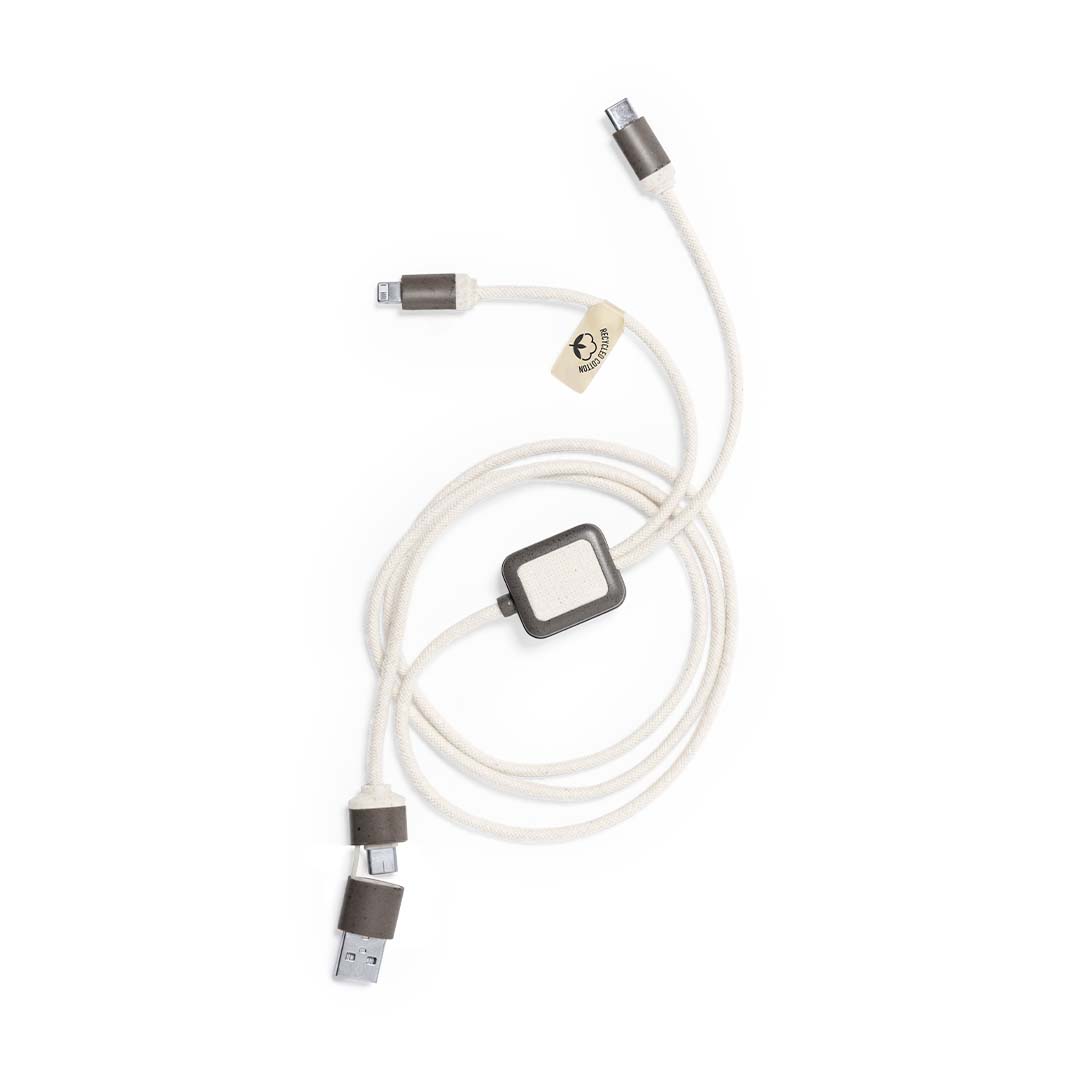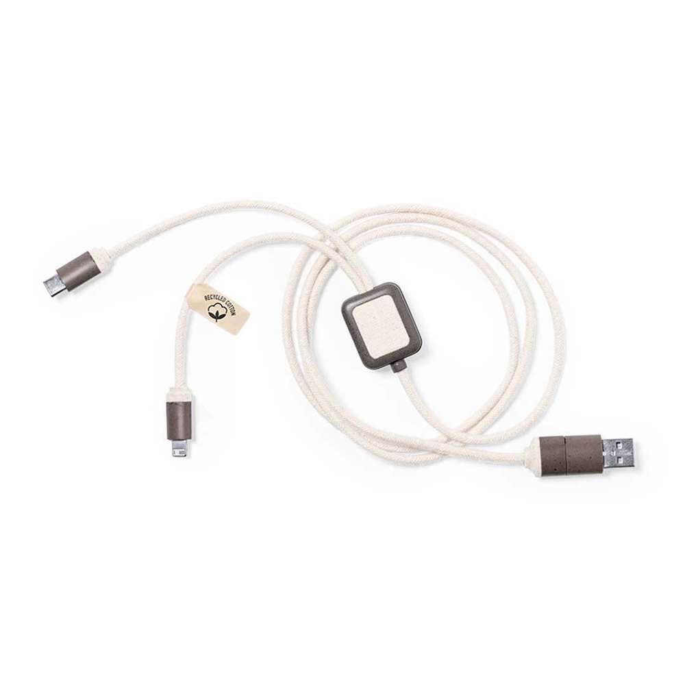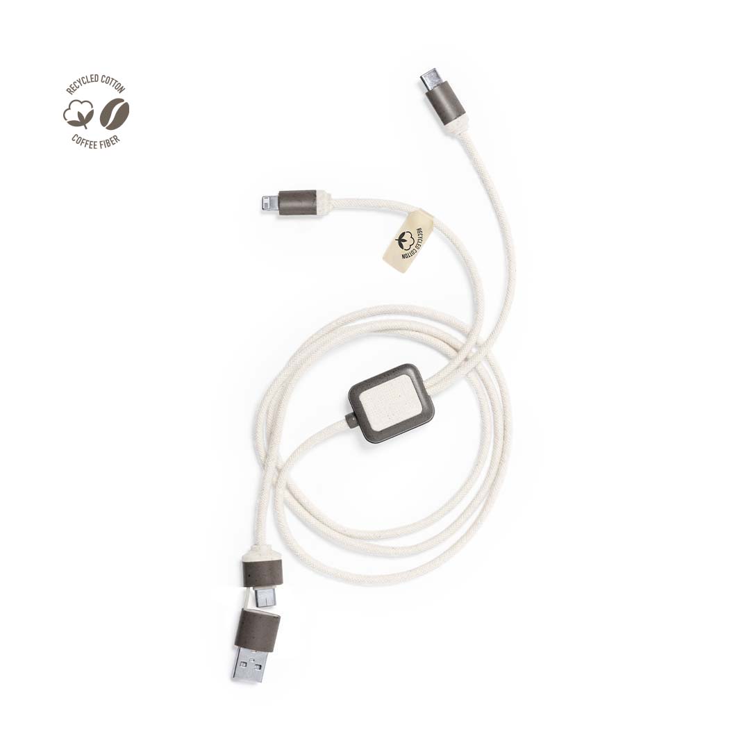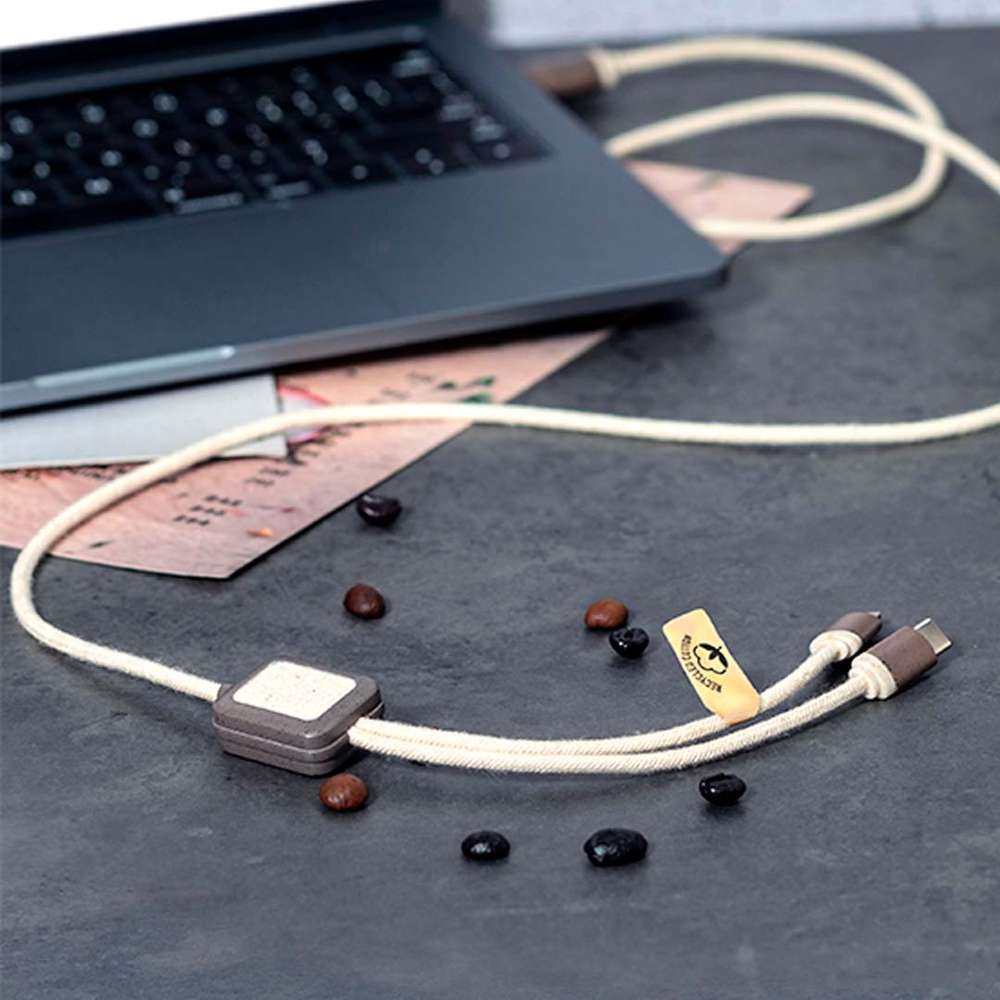 Cable cargador fabricado en fibra de café, con cables recubiertos en algodón reciclado. Conexiones de entrada Tipo C y USB, con salidas Tipo C, Lightning y Micro USB. 5V DC 2.4A. Con distintivos de fibra de café y algodón reciclado. Presentado en bolsa individual de diseño kraft con autocierre.