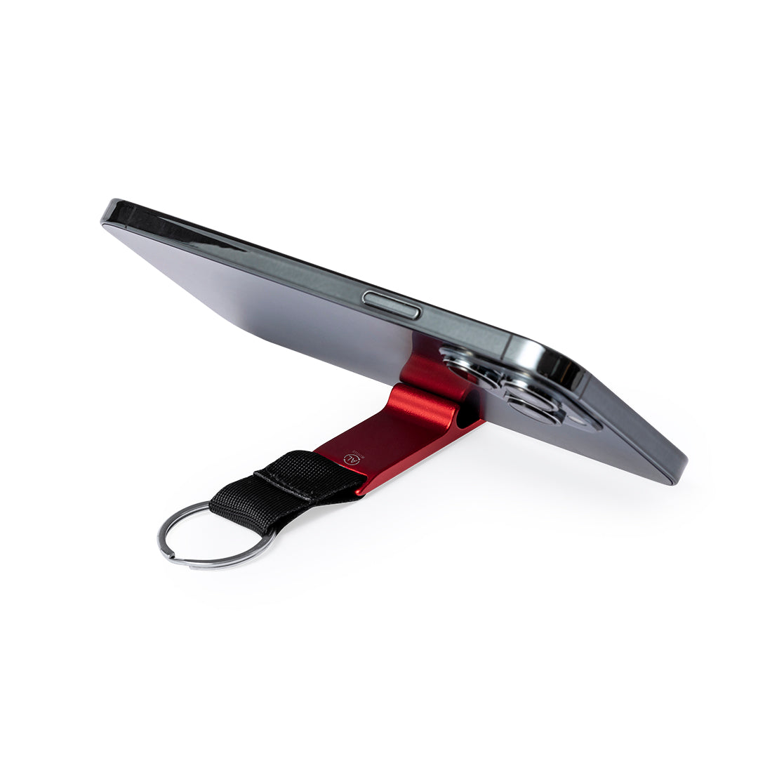 Llavero soporte fabricado en Aluminio Reciclado, especialmente diseñado para smartphone y tablet. De acabado mate, con cinta en nylon de color negro e ideal para marcaje en láser. Disponible en amplia gama de colores, con logotipo Aluminio Reciclado grabado y presentado individualmente en bolsa reciclada.