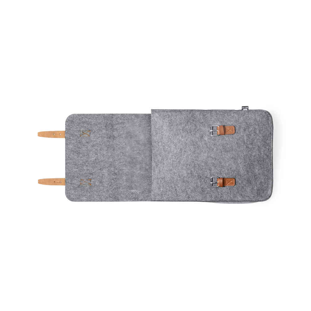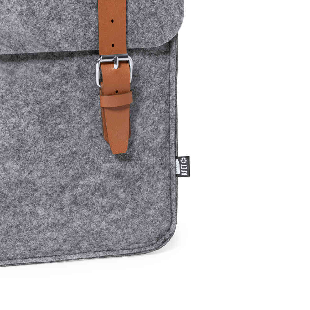 Mochila de diseño fabricada en resistente fieltro RPET, con tiras de cierre, asa de transporte y cintas para hombros en polipiel. Amplio compartimento principal, solapa con tiras ajustables y cierre de hebilla metálica. Con cintas para hombros ajustables y distintivo RPET en etiqueta exterior.