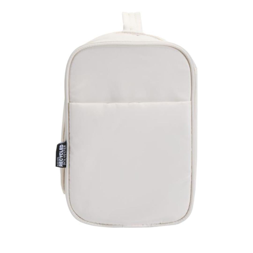 • Neceser colgante blanco reciclado certificado GRS con huella carbono calculada 0,066 kg CO2e auditado por amfori ideal para welcome packs sostenibles
