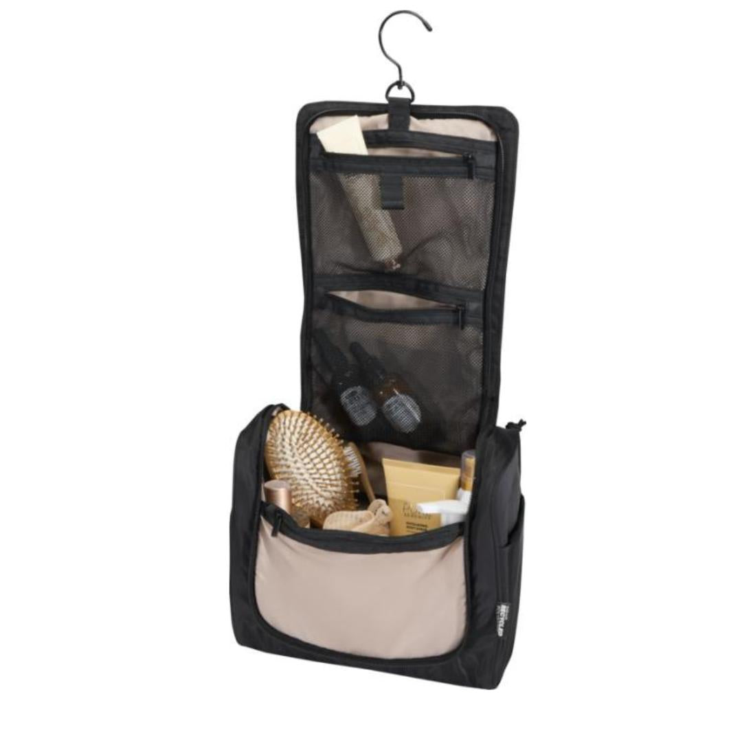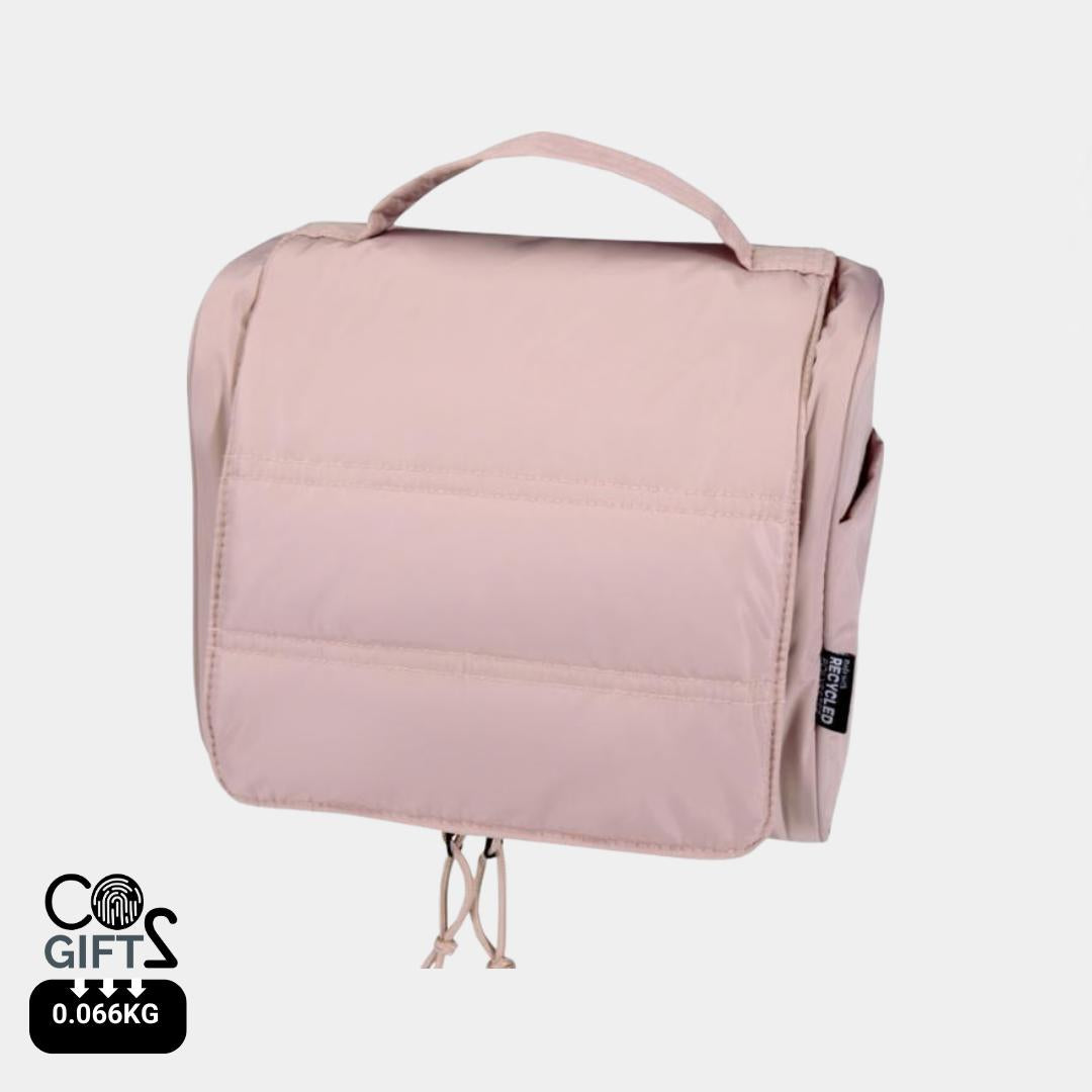 • Neceser colgante reciclado certificado GRS con huella carbono calculada 0,066 kg CO2e auditado por amfori ideal para regalos promocionales sostenibles