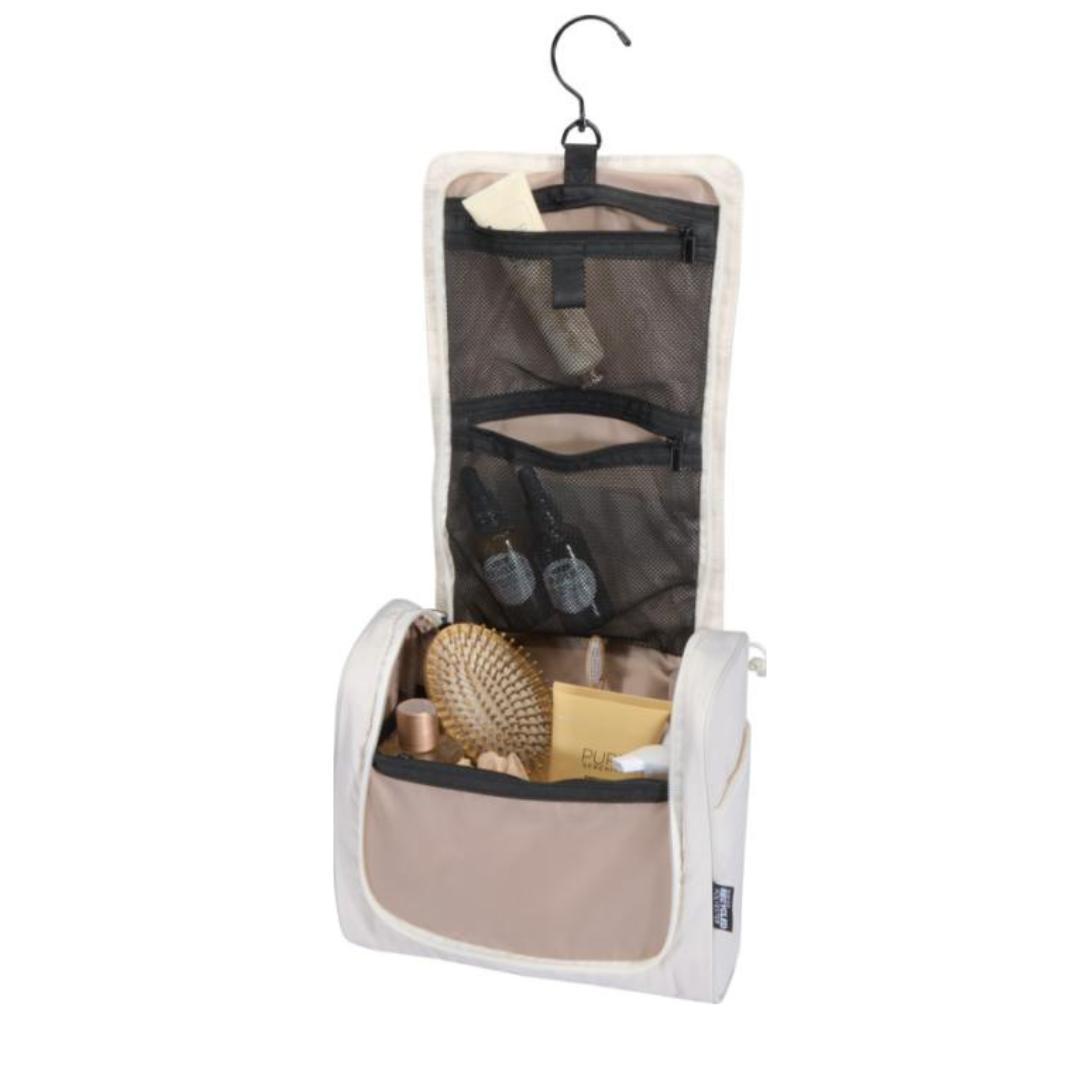 Neceser colgante blanco reciclado certificado GRS con huella carbono calculada 0,066 kg CO2e auditado por amfori ideal para welcome packs sostenibles