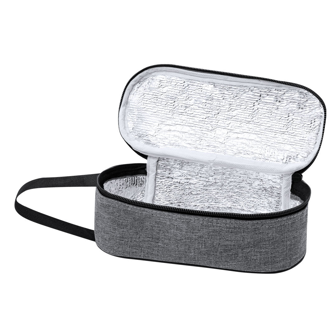 Portabocadillos térmico exterior fabricado en RPET 600D e interior isotermo en aluminio. Con cierre de cremallera y asa de transporte. Distintivo de RPET en etiqueta.