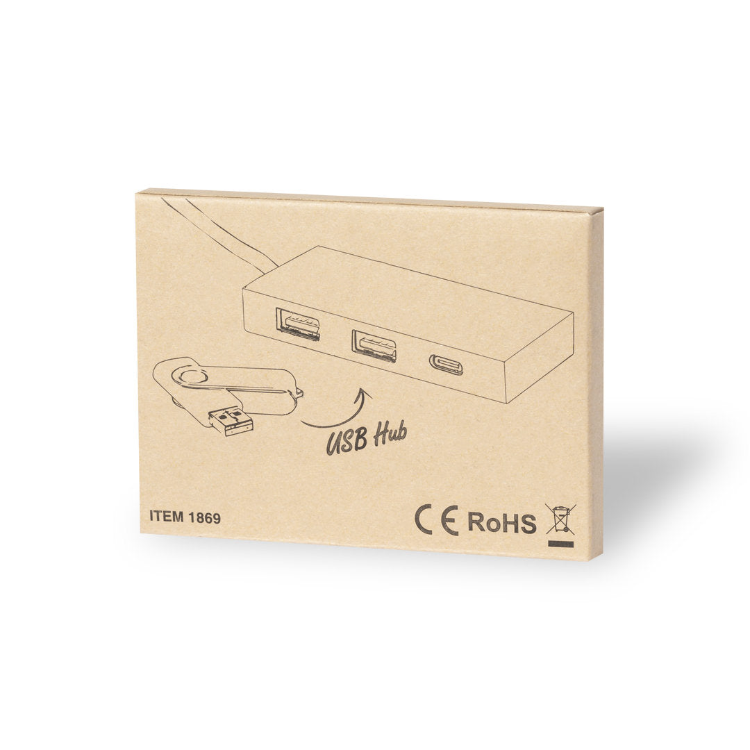 Puerto USB 2.0 fabricado en cartón reciclado. Incluye puerto Tipo C y 2 puertos USB, con entrada dual USB/Tipo C. Presentado en caja individual de diseño kraft.