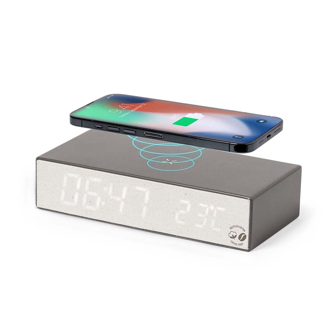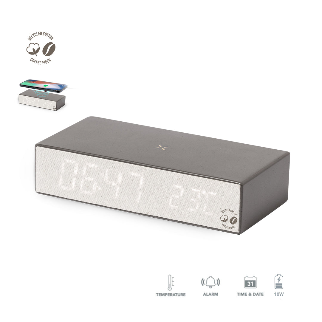 Reloj multifunción con cargador inalámbrico 10W integrado. Fabricado en en fibra de café y algodón reciclado. Función hora (12/24h), alarma, con intensidad de luz regulable. Alimentación mediante conexión USB. Compatible con dispositivos equipados con tecnología de carga inalámbrica y presentado en atractiva caja de diseño kraft. Con distintivo de fibra de café y algodón reciclado. Incluye manual de instruccions en español e inglés.