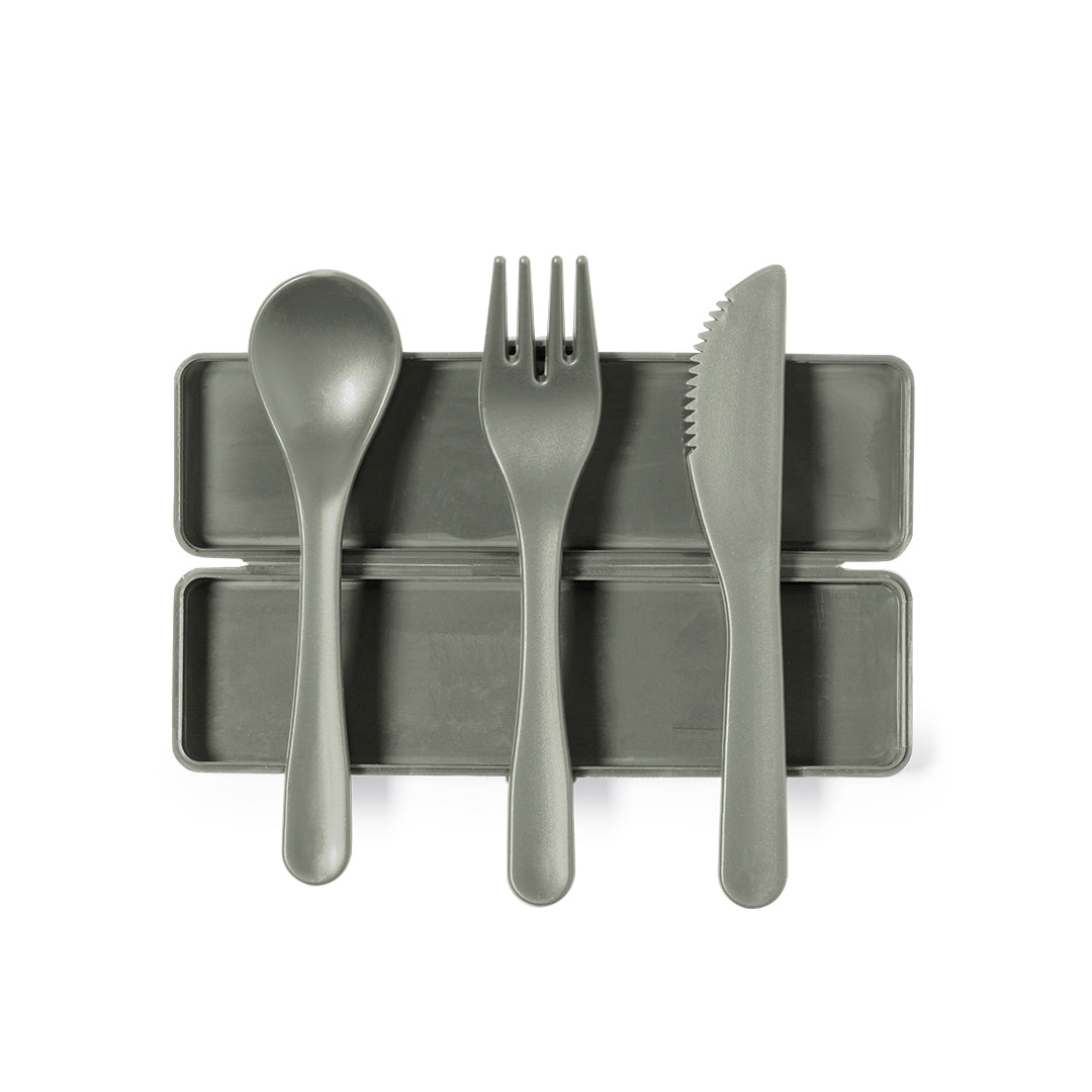 Set de cubiertos fabricados en PP reciclado libre de BPA, con estuche de presentación a juego. Incluye cuchara, tenedor y cuchillo. Dispone de Certificación Food Grade, garantizando la seguridad cuando los alimentos entran en contacto con el material usado para fabricar el producto. Estuche esterior y cubiertos en acabado mate disponibles en variada gamas de colores. Presentados en bolsa individual reciclada.