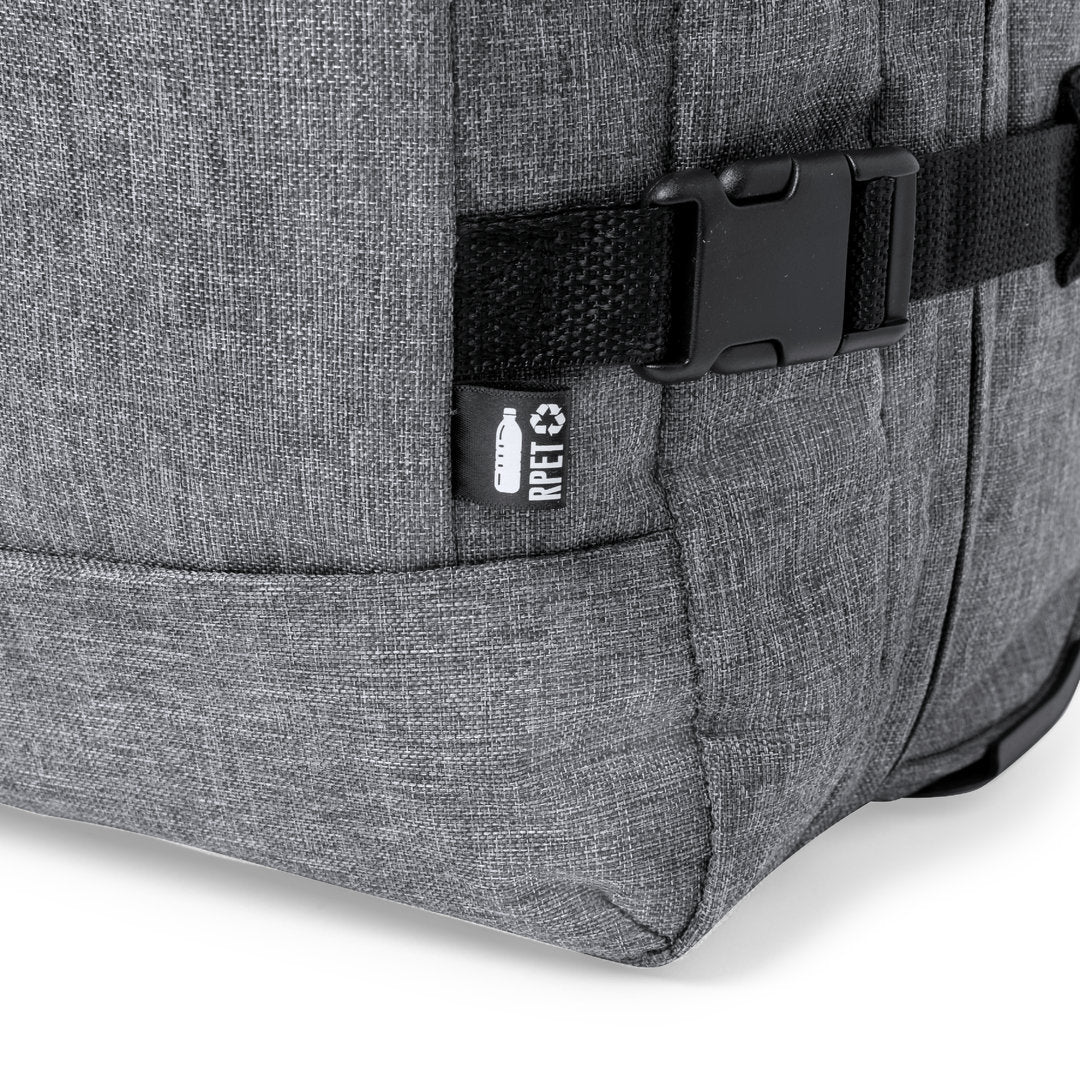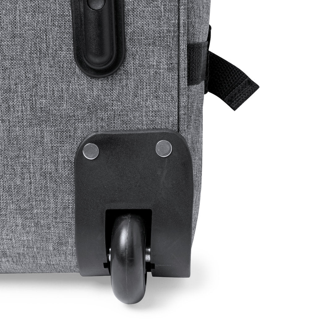 Interior forrado y con cintas elásticas de sujeción. Exterior con 2 cintas ajustables, cierres de hebilla, bolsillo frontal con cierre de cremallera invisible y 2 asas acolchadas de transporte. Mecanismo extensible metálico en negro, con cómoda asa de transporte y 2 ruedas. Distintivo RPET en etiqueta exterior.