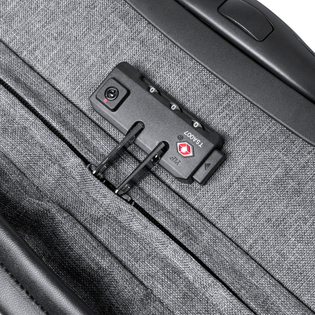 Trolley de línea nature fabricado en resistente 300D RPET. Compartimento principal con cierre de cremallera de doble tirador conforme a los estándares TSA -Administración de la Seguridad en el Transporte-, que permite a las autoridades de aduanas inspeccionar el contenido del equipaje sin tener que forzar o romper el cierre, usando una llave especial a disposición de la autoridad.