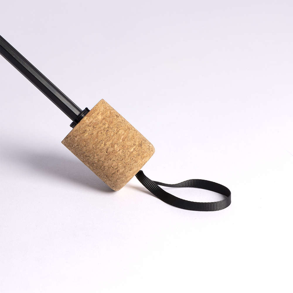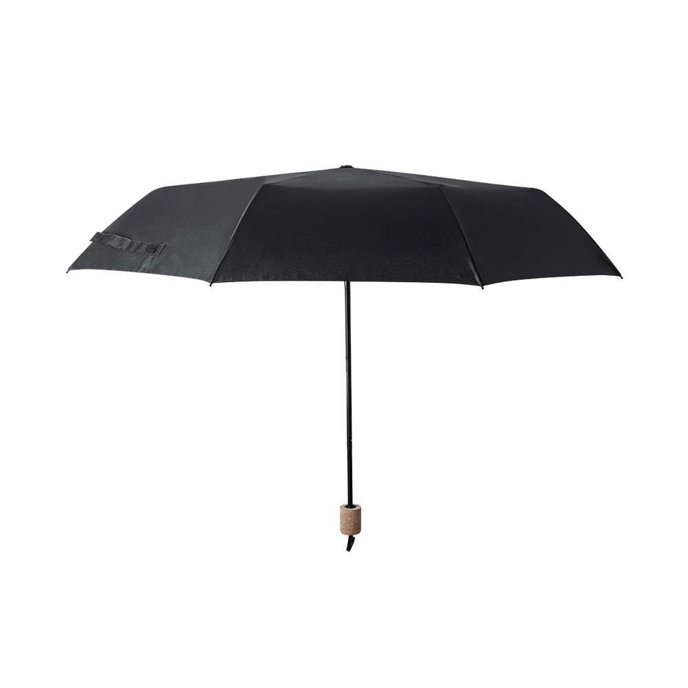 Paraguas plegable de color negro con 98cm de diámetro. En material pongee 190T RPET y mango de corcho. De apertura manual, con sistema anti viento y varillas en fibra de vidrio. Con etiqueta distintiva RPET.
